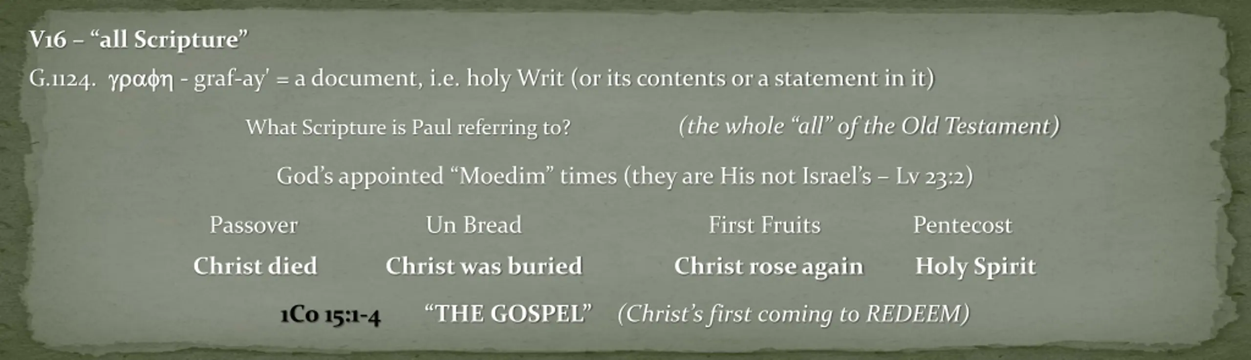 V16 all Scripture G.1124. - graf-ay' = a document, i.e. holy Writ (or its contents or a statement in it) (the whole all of the Old Testament) What Scripture is Paul referring to? God s appointed Moedim times (they are His not Israel s Lv 23:2) Passover Un Bread First Fruits Pentecost Christ died Christ was buried Christ rose again Holy Spirit 1Co 15:1-4 THE GOSPEL (Christ s first coming to REDEEM)