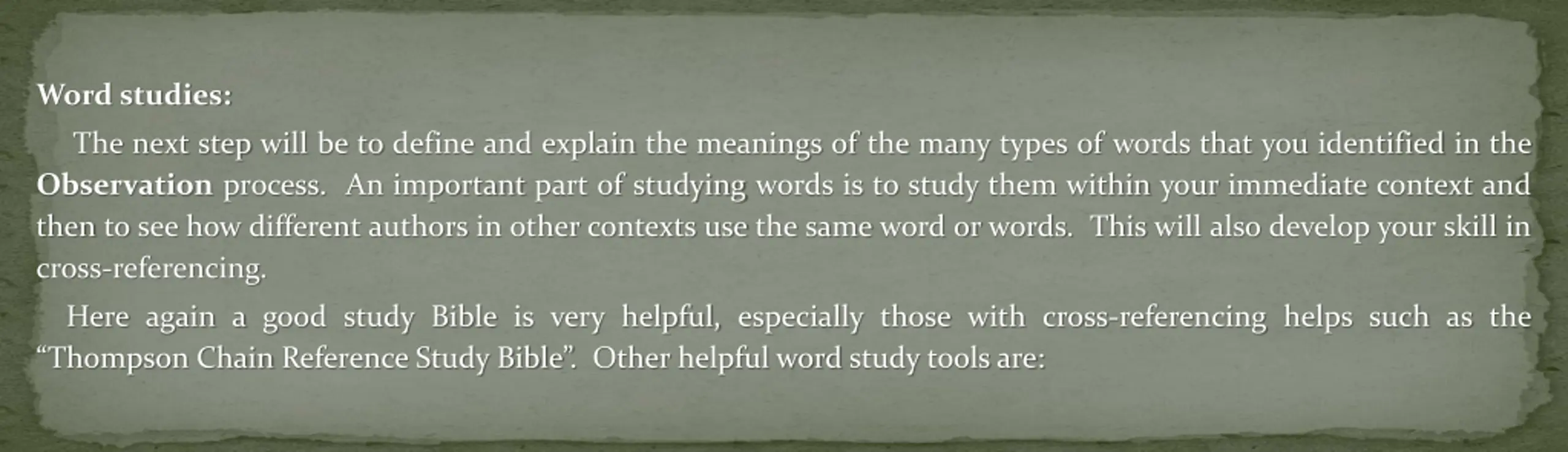 Word studies: The next step will be to define and explain the meanings of the many types of words that you identified in the Observation process. An important part of studying words is to study them within your immediate context and then to see how different authors in other contexts use the same word or words. This will also develop your skill in cross-referencing. Here again a good study Bible is very helpful, especially those with cross-referencing helps such as the Thompson Chain Reference Study Bible . Other helpful word study tools are: