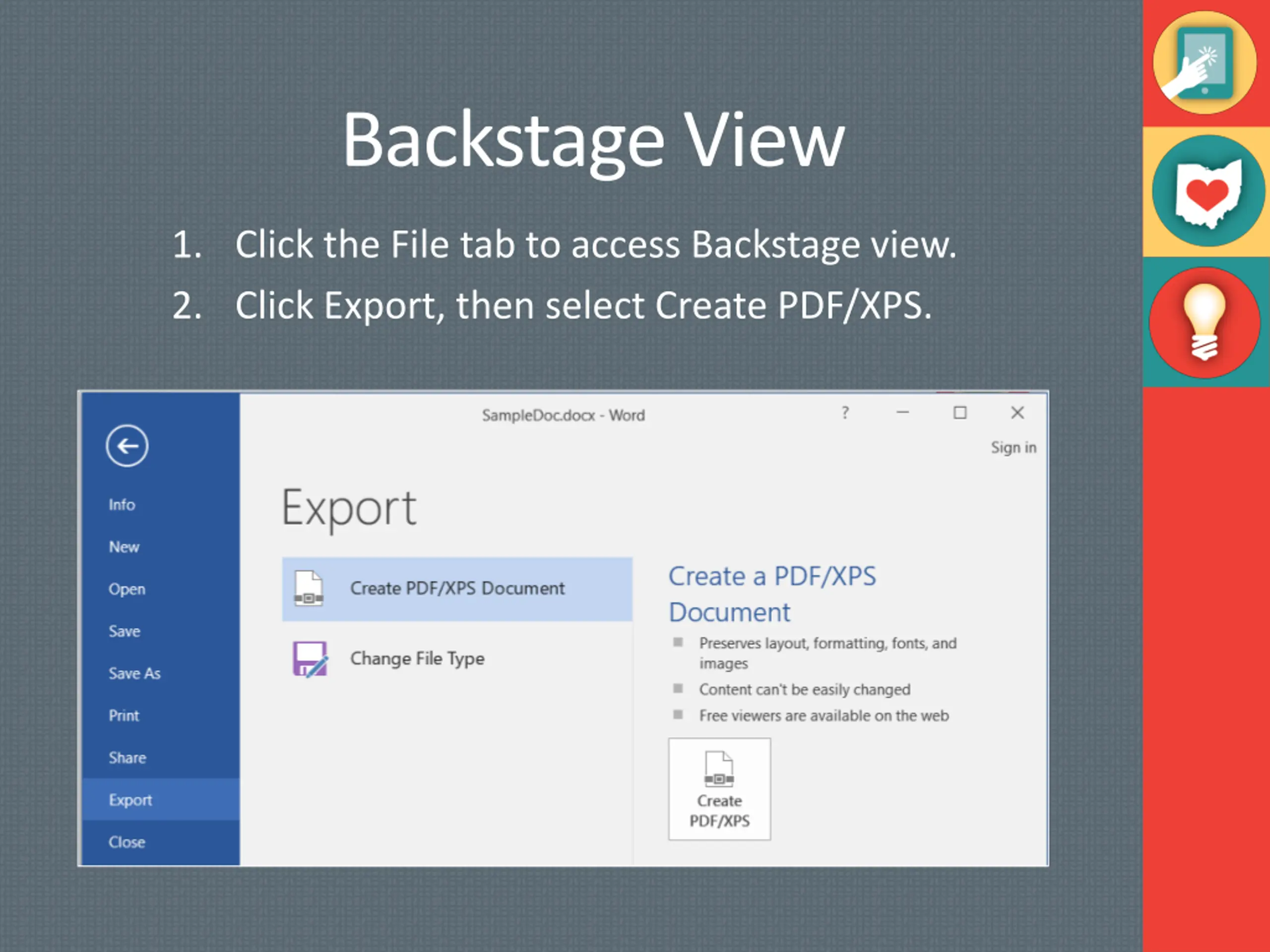 Backstage View 1. Click the File tab to access Backstage view. 2. Click Export, then select Create PDF/XPS.