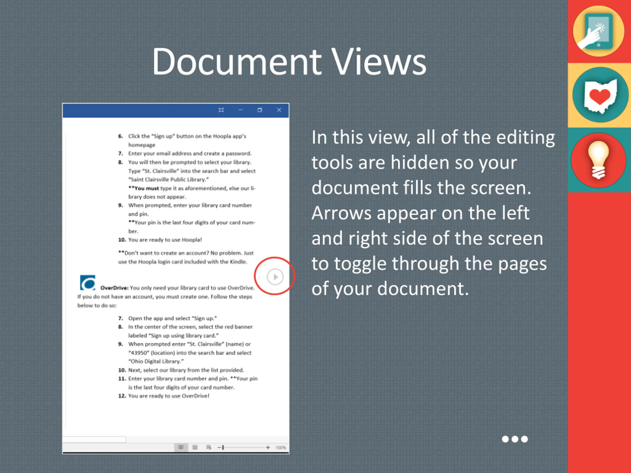 Document Views In this view, all of the editing tools are hidden so your document fills the screen. Arrows appear on the left and right side of the screen to toggle through the pages of your document.