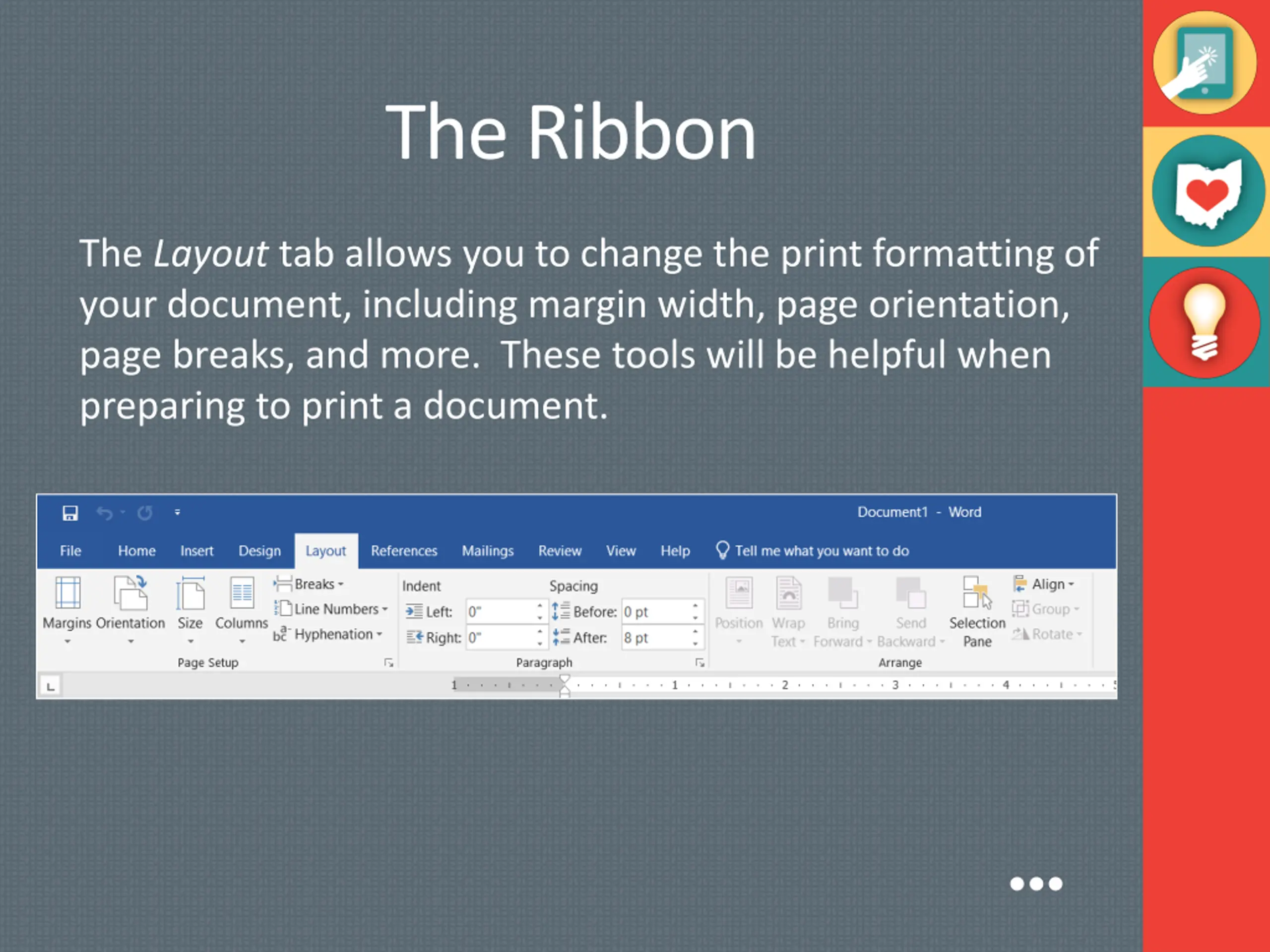 The Ribbon The Layout tab allows you to change the print formatting of your document, including margin width, page orientation, page breaks, and more. These tools will be helpful when preparing to print a document.