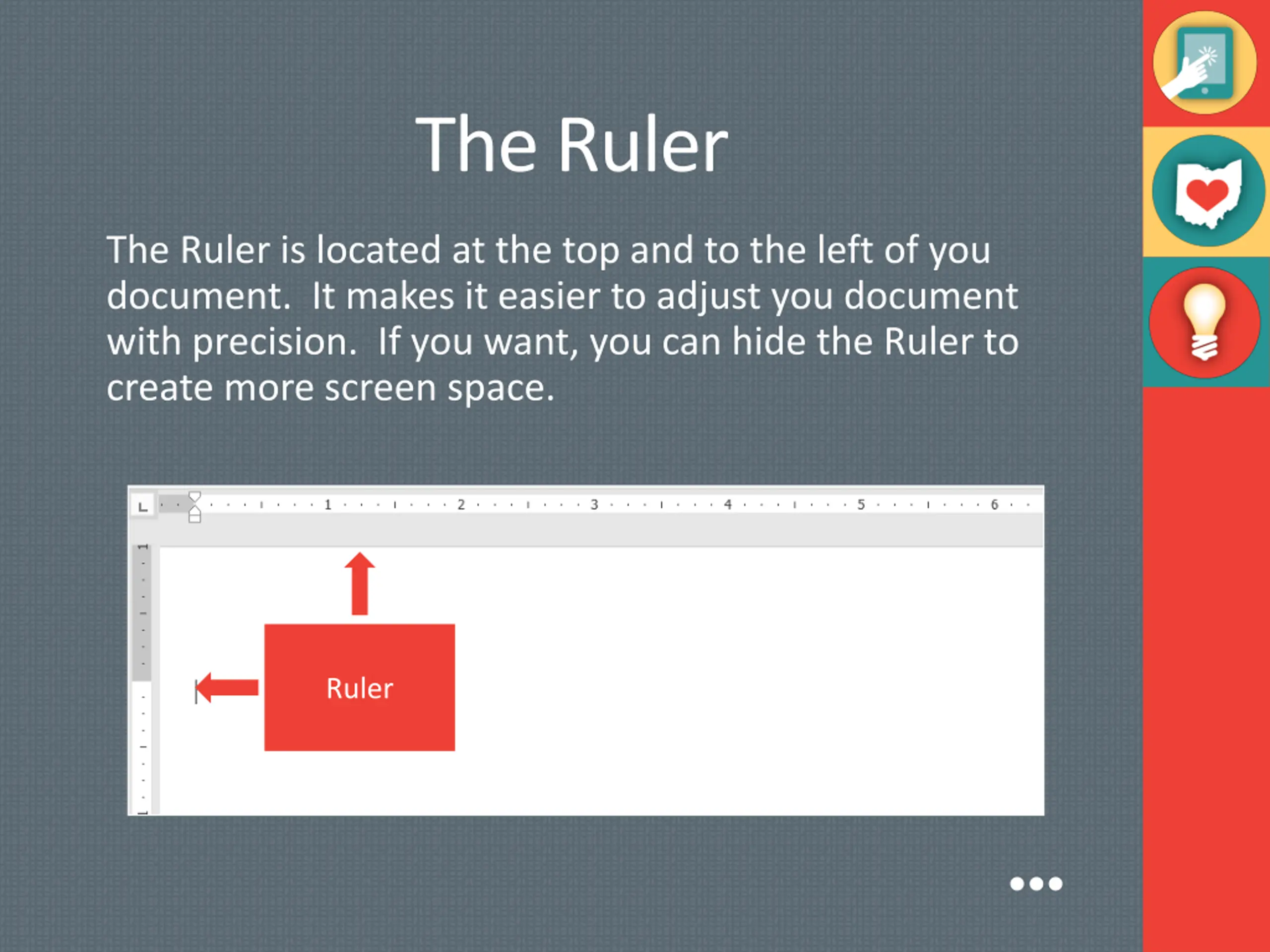 The Ruler To show or hide the Ruler: 1. Click the view tab. 2. Click the check box next to Ruler show or hide the ruler.