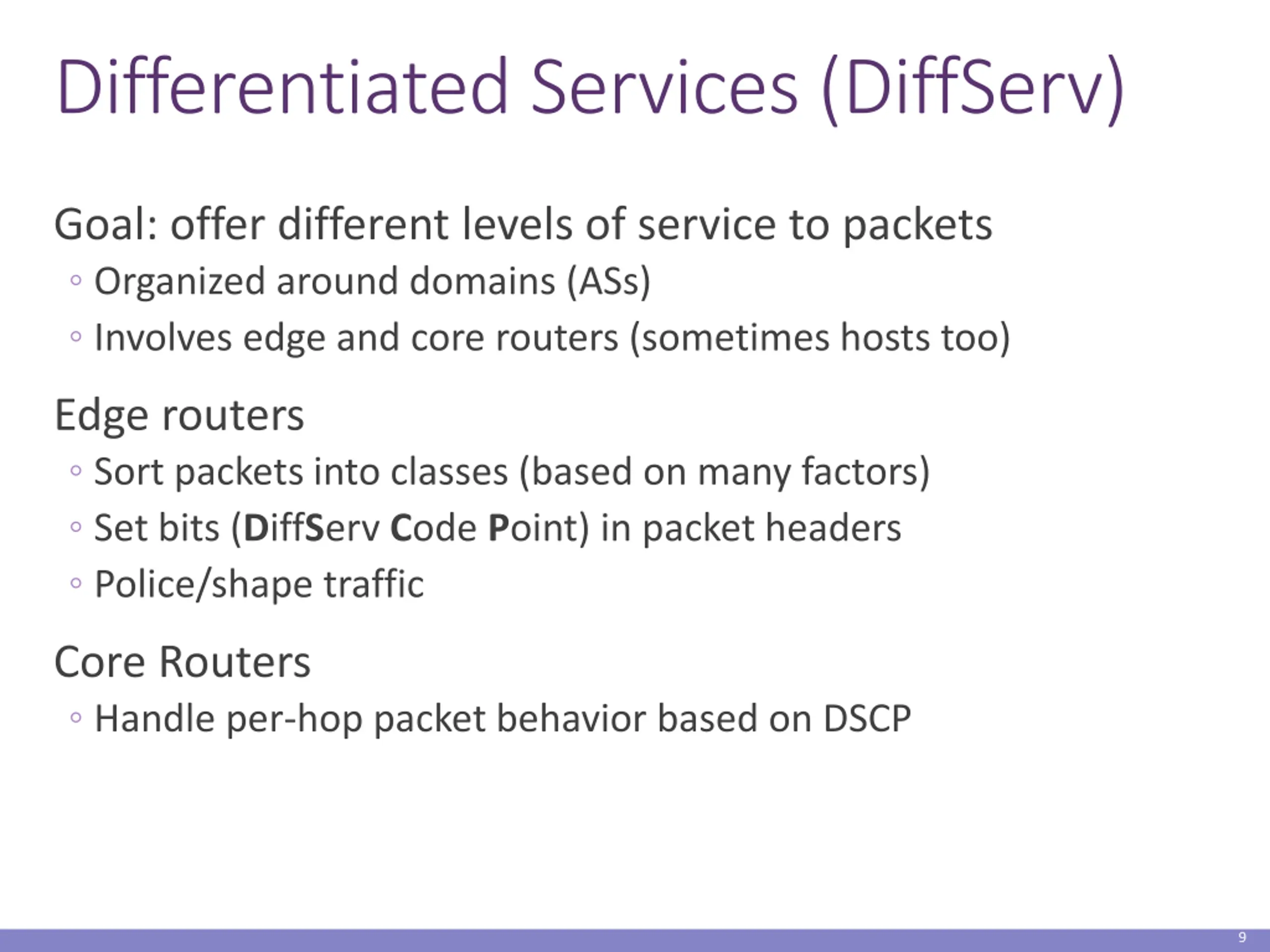 Differentiated Services (DiffServ) Goal: offer different levels of service to packets Organized around domains (ASs) Involves edge and core routers (sometimes hosts too) Edge routers Sort packets into classes (based on many factors) Set bits (DiffServ Code Point) in packet headers Police/shape traffic Core Routers Handle per-hop packet behavior based on DSCP 9