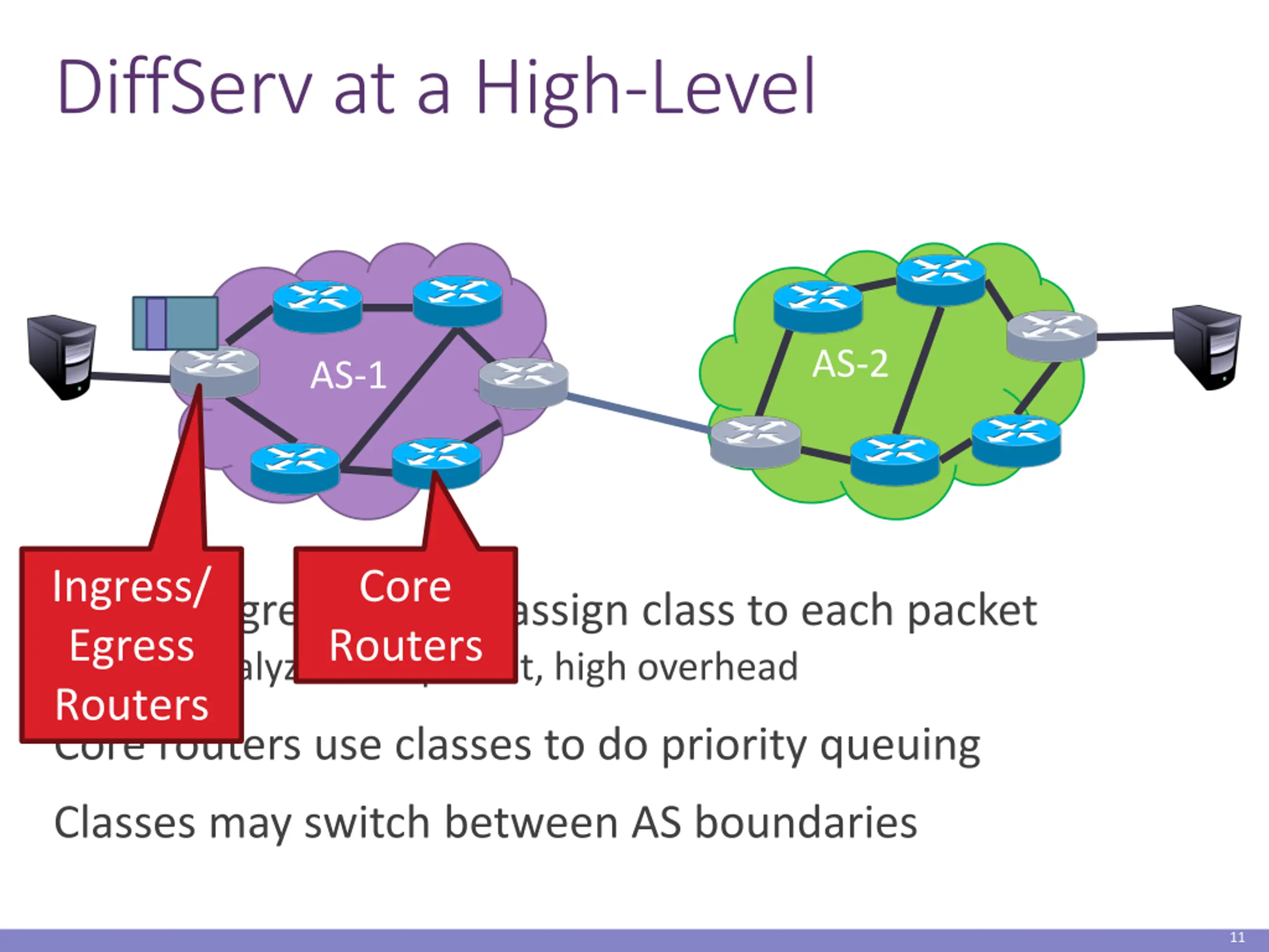 DiffServ at a High-Level AS-2 AS-1 Ingress/ Core Routers Ingress/Egress routers assign class to each packet Must analyze each packet, high overhead Egress Routers Core routers use classes to do priority queuing Classes may switch between AS boundaries 11