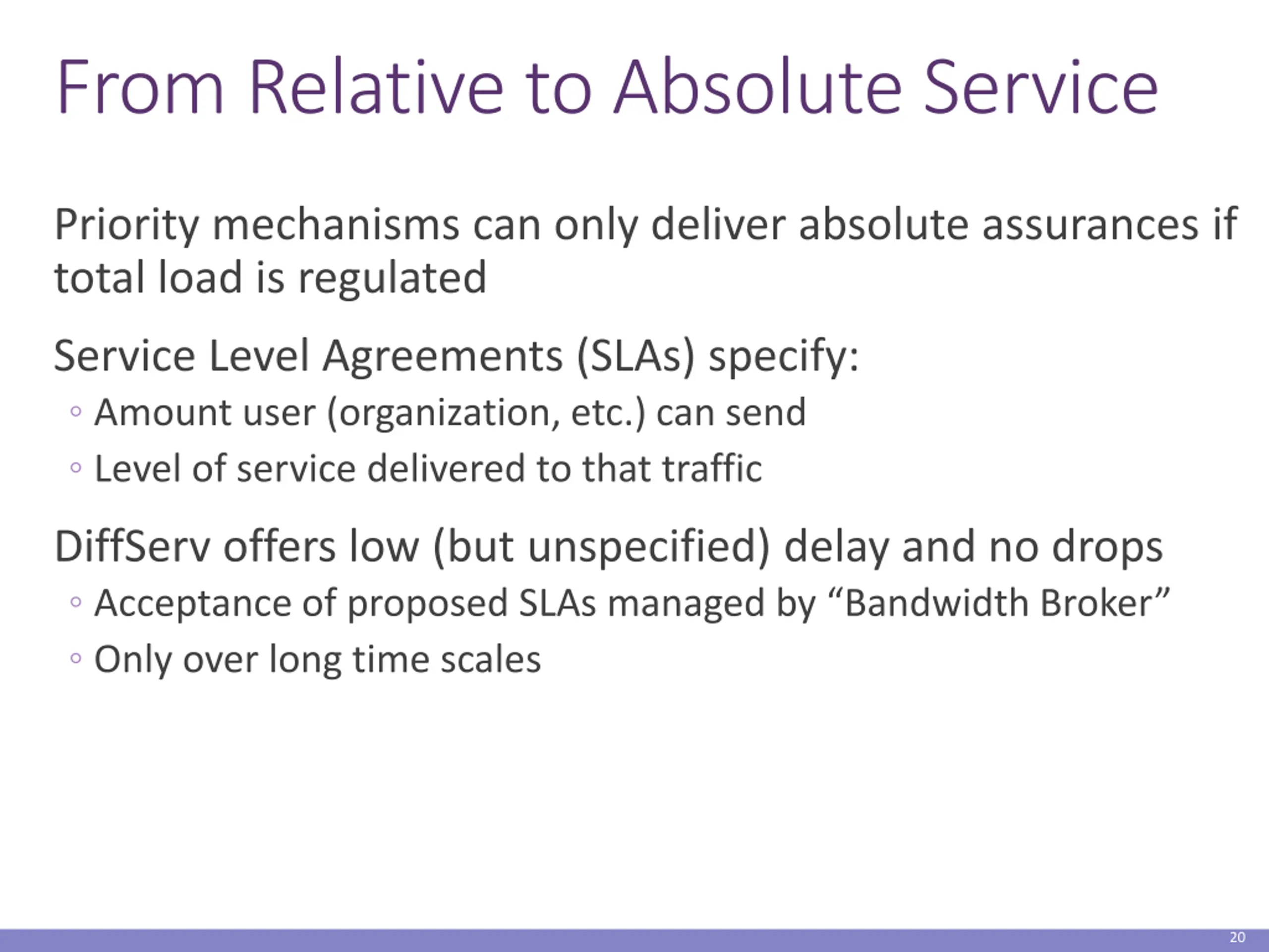 From Relative to Absolute Service Priority mechanisms can only deliver absolute assurances if total load is regulated Service Level Agreements (SLAs) specify: Amount user (organization, etc.) can send Level of service delivered to that traffic DiffServ offers low (but unspecified) delay and no drops Acceptance of proposed SLAs managed by Bandwidth Broker Only over long time scales 20