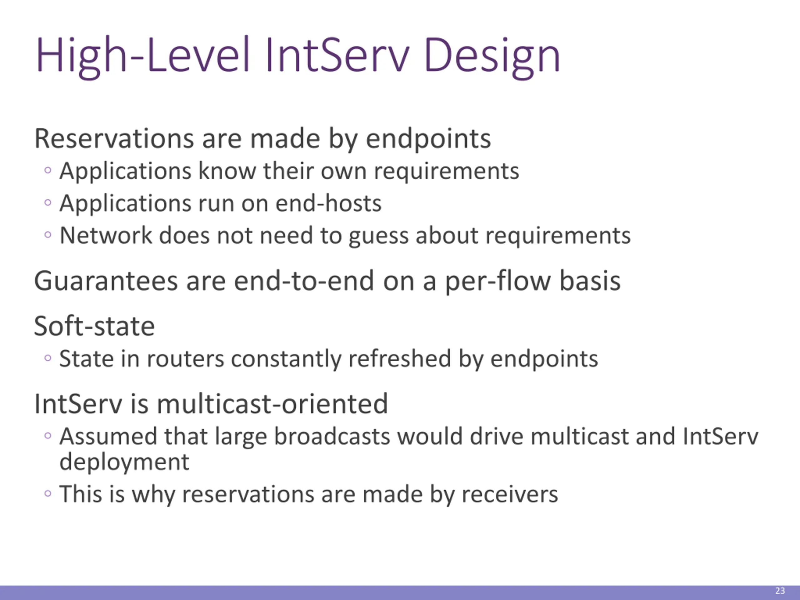 High-Level IntServ Design Reservations are made by endpoints Applications know their own requirements Applications run on end-hosts Network does not need to guess about requirements Guarantees are end-to-end on a per-flow basis Soft-state State in routers constantly refreshed by endpoints IntServ is multicast-oriented Assumed that large broadcasts would drive multicast and IntServ deployment This is why reservations are made by receivers 23