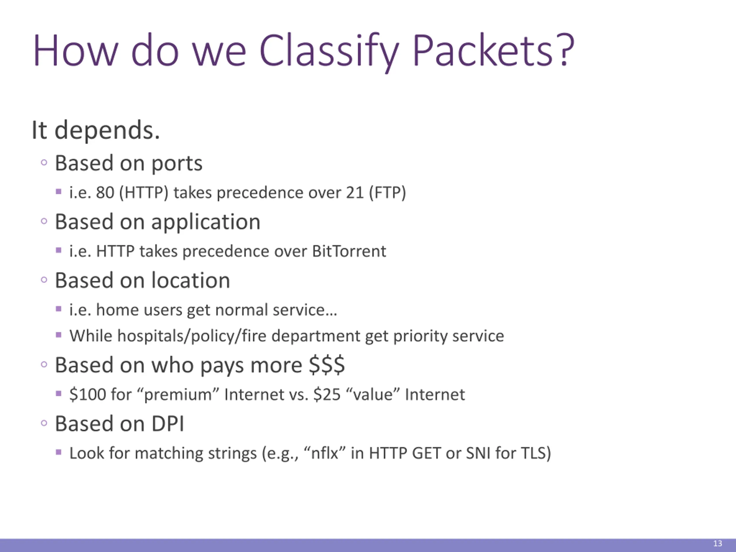 How do we Classify Packets? It depends. Based on ports i.e. 80 (HTTP) takes precedence over 21 (FTP) Based on application i.e. HTTP takes precedence over BitTorrent Based on location i.e. home users get normal service While hospitals/policy/fire department get priority service Based on who pays more $$$ $100 for premium Internet vs. $25 value Internet Based on DPI Look for matching strings (e.g., nflx in HTTP GET or SNI for TLS) 13