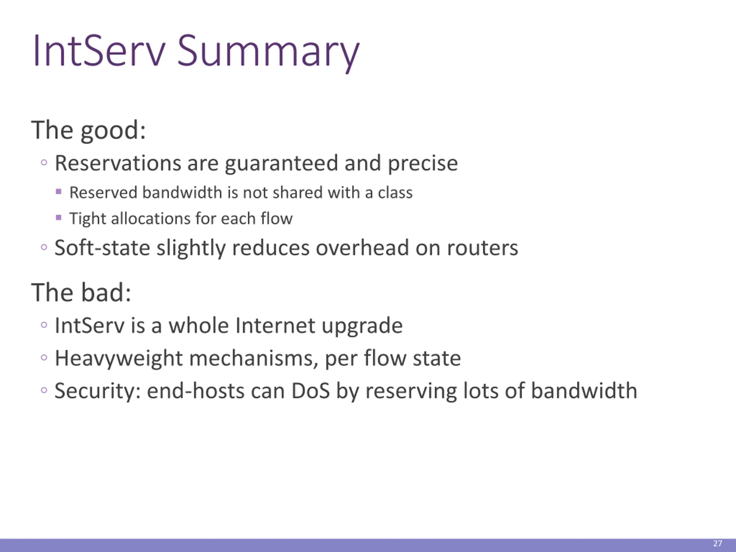 IntServ Summary The good: Reservations are guaranteed and precise Reserved bandwidth is not shared with a class Tight allocations for each flow Soft-state slightly reduces overhead on routers The bad: IntServ is a whole Internet upgrade Heavyweight mechanisms, per flow state Security: end-hosts can DoS by reserving lots of bandwidth 27