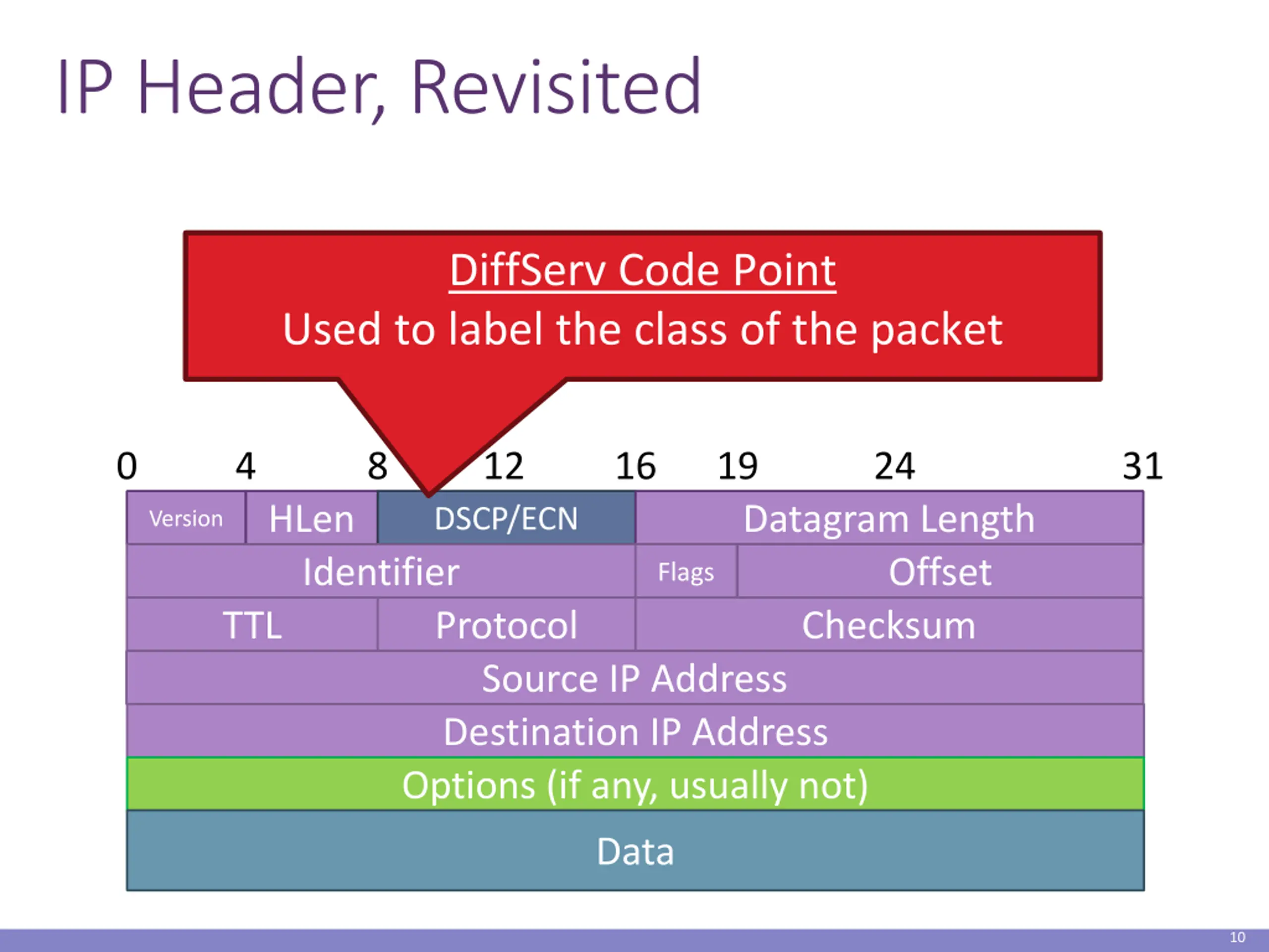 IP Header, Revisited DiffServ Code Point Used to label the class of the packet 0 4 8 12 16 19 24 31 HLen Identifier TTL Datagram Length Offset Checksum DSCP/ECN Version Flags Protocol Source IP Address Destination IP Address Options (if any, usually not) Data 10