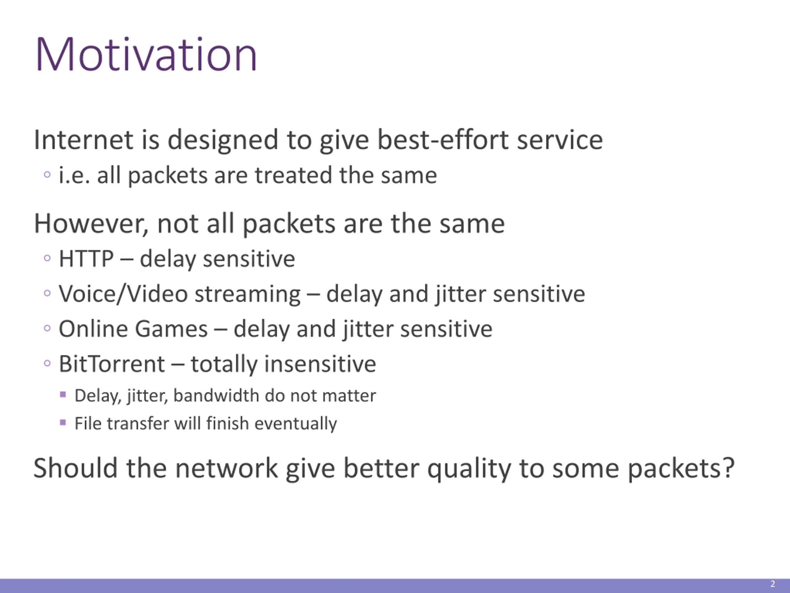 Motivation Internet is designed to give best-effort service i.e. all packets are treated the same However, not all packets are the same HTTP delay sensitive Voice/Video streaming delay and jitter sensitive Online Games delay and jitter sensitive BitTorrent totally insensitive Delay, jitter, bandwidth do not matter File transfer will finish eventually Should the network give better quality to some packets? 2