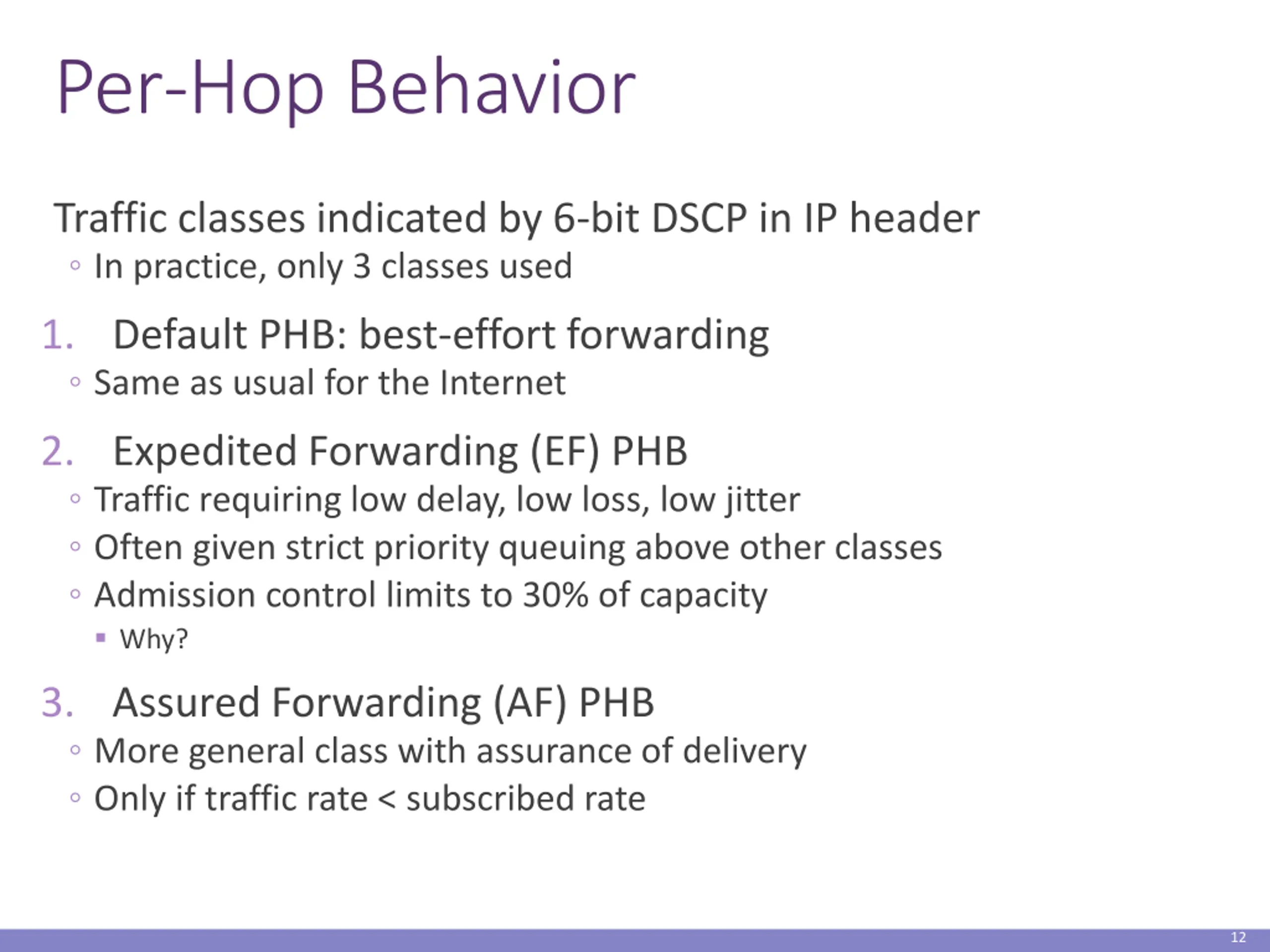 Per-Hop Behavior Traffic classes indicated by 6-bit DSCP in IP header In practice, only 3 classes used 1. Default PHB: best-effort forwarding Same as usual for the Internet 2. Expedited Forwarding (EF) PHB Traffic requiring low delay, low loss, low jitter Often given strict priority queuing above other classes Admission control limits to 30% of capacity Why? 3. Assured Forwarding (AF) PHB More general class with assurance of delivery Only if traffic rate < subscribed rate 12