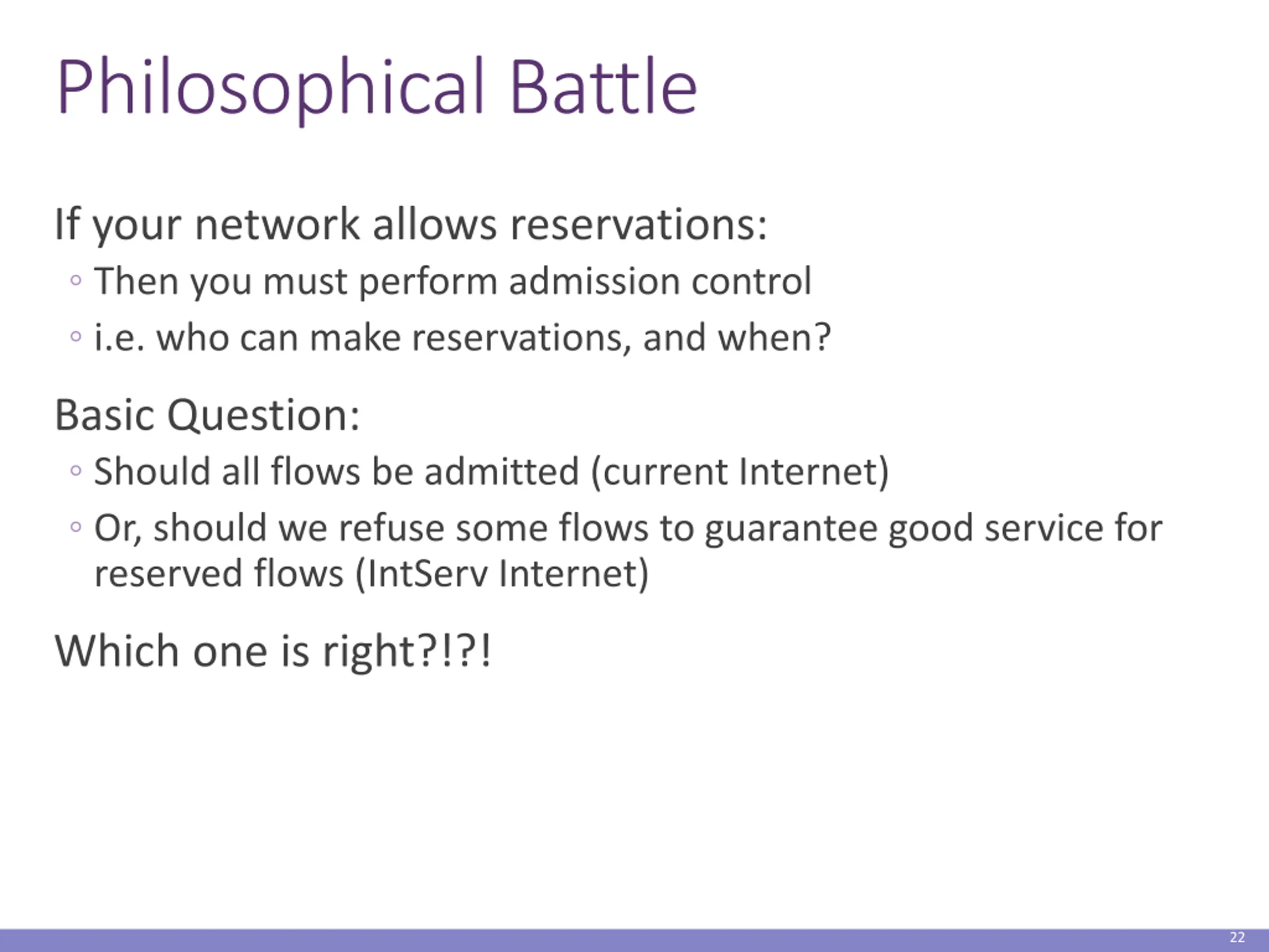 Philosophical Battle If your network allows reservations: Then you must perform admission control i.e. who can make reservations, and when? Basic Question: Should all flows be admitted (current Internet) Or, should we refuse some flows to guarantee good service for reserved flows (IntServ Internet) Which one is right?!?! 22