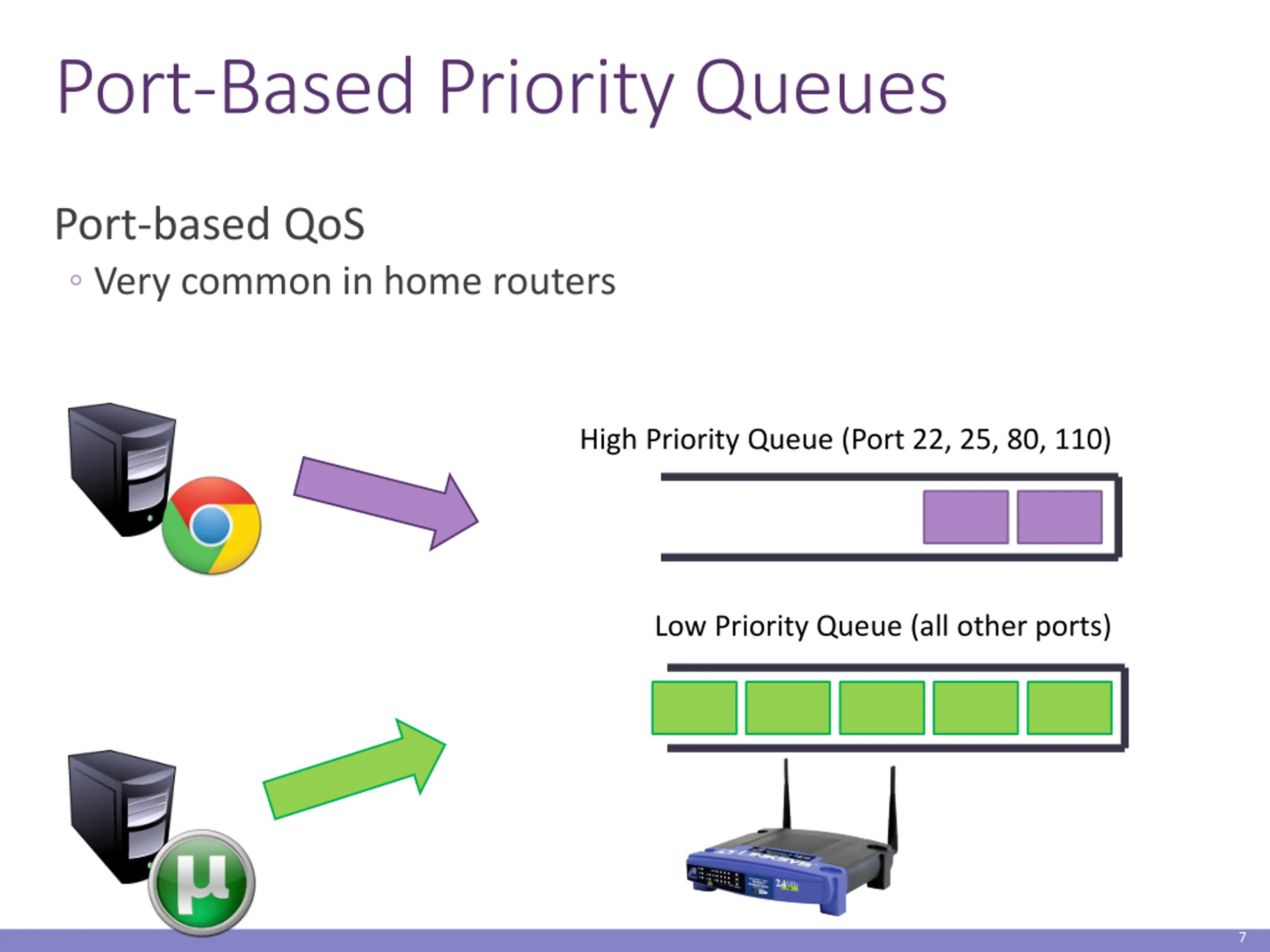 Port-Based Priority Queues Port-based QoS Very common in home routers High Priority Queue (Port 22, 25, 80, 110) Low Priority Queue (all other ports) 7