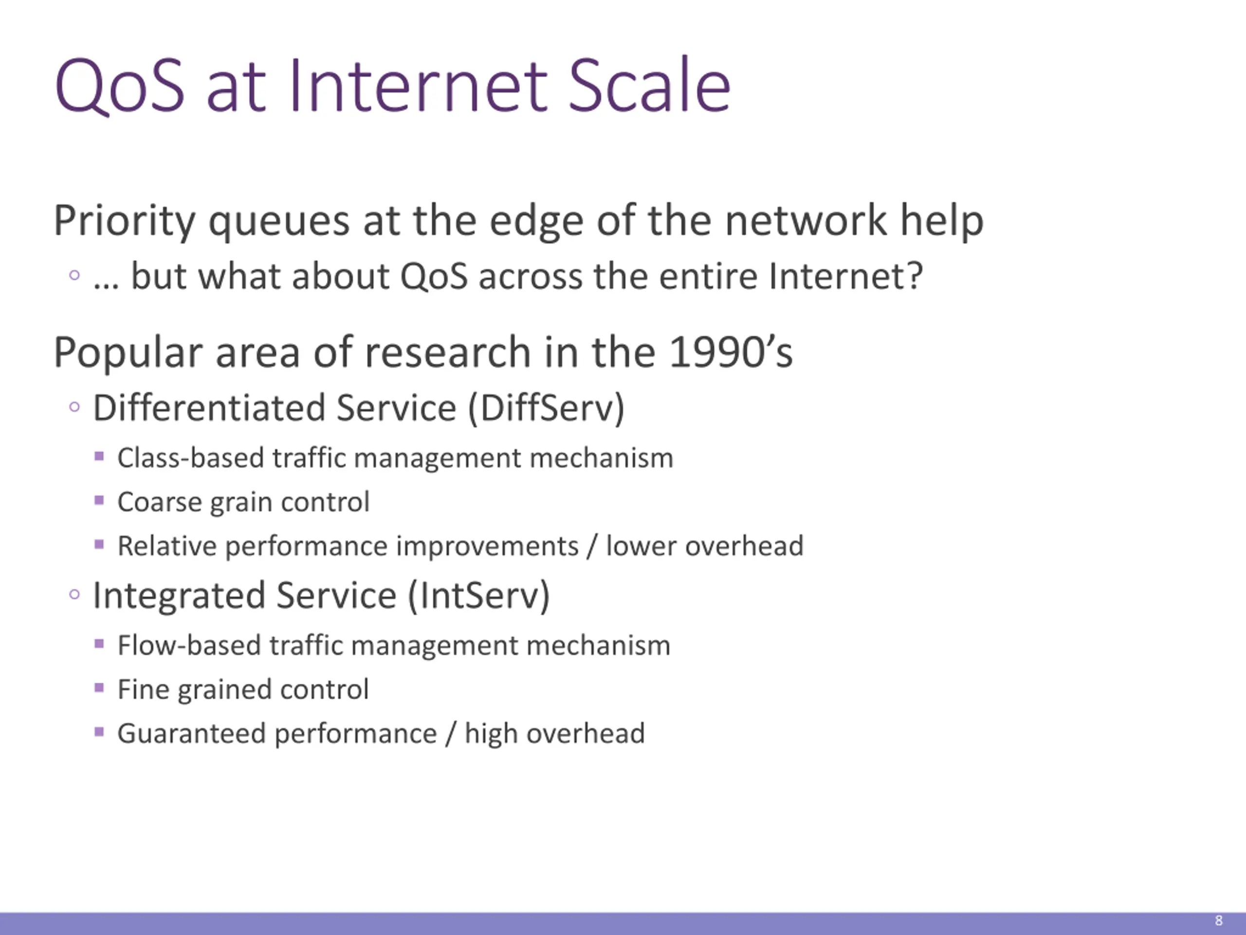 QoS at Internet Scale Priority queues at the edge of the network help but what about QoS across the entire Internet? Popular area of research in the 1990 s Differentiated Service (DiffServ) Class-based traffic management mechanism Coarse grain control Relative performance improvements / lower overhead Integrated Service (IntServ) Flow-based traffic management mechanism Fine grained control Guaranteed performance / high overhead 8