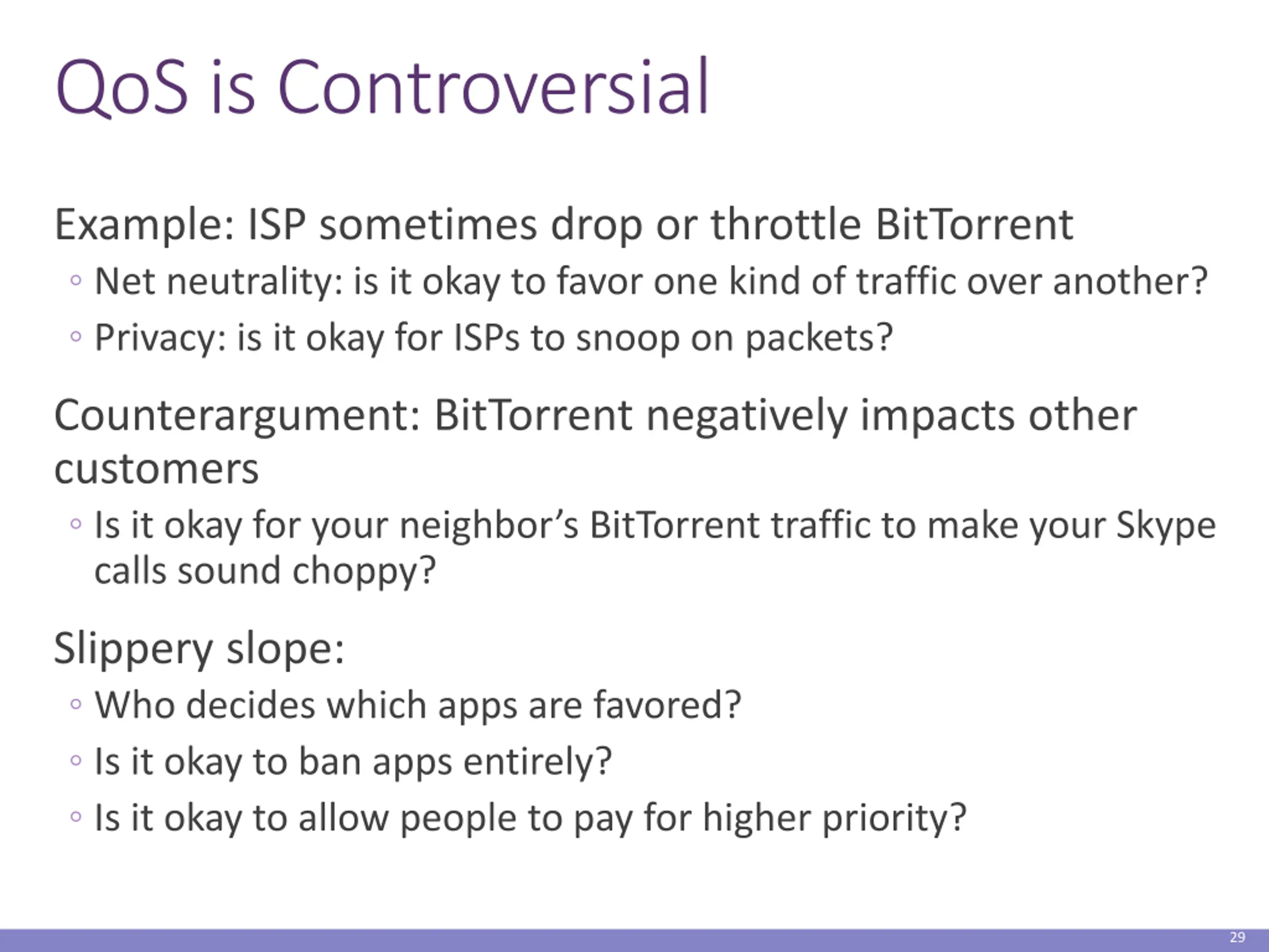 QoS is Controversial Example: ISP sometimes drop or throttle BitTorrent Net neutrality: is it okay to favor one kind of traffic over another? Privacy: is it okay for ISPs to snoop on packets? Counterargument: BitTorrent negatively impacts other customers Is it okay for your neighbor s BitTorrent traffic to make your Skype calls sound choppy? Slippery slope: Who decides which apps are favored? Is it okay to ban apps entirely? Is it okay to allow people to pay for higher priority? 29