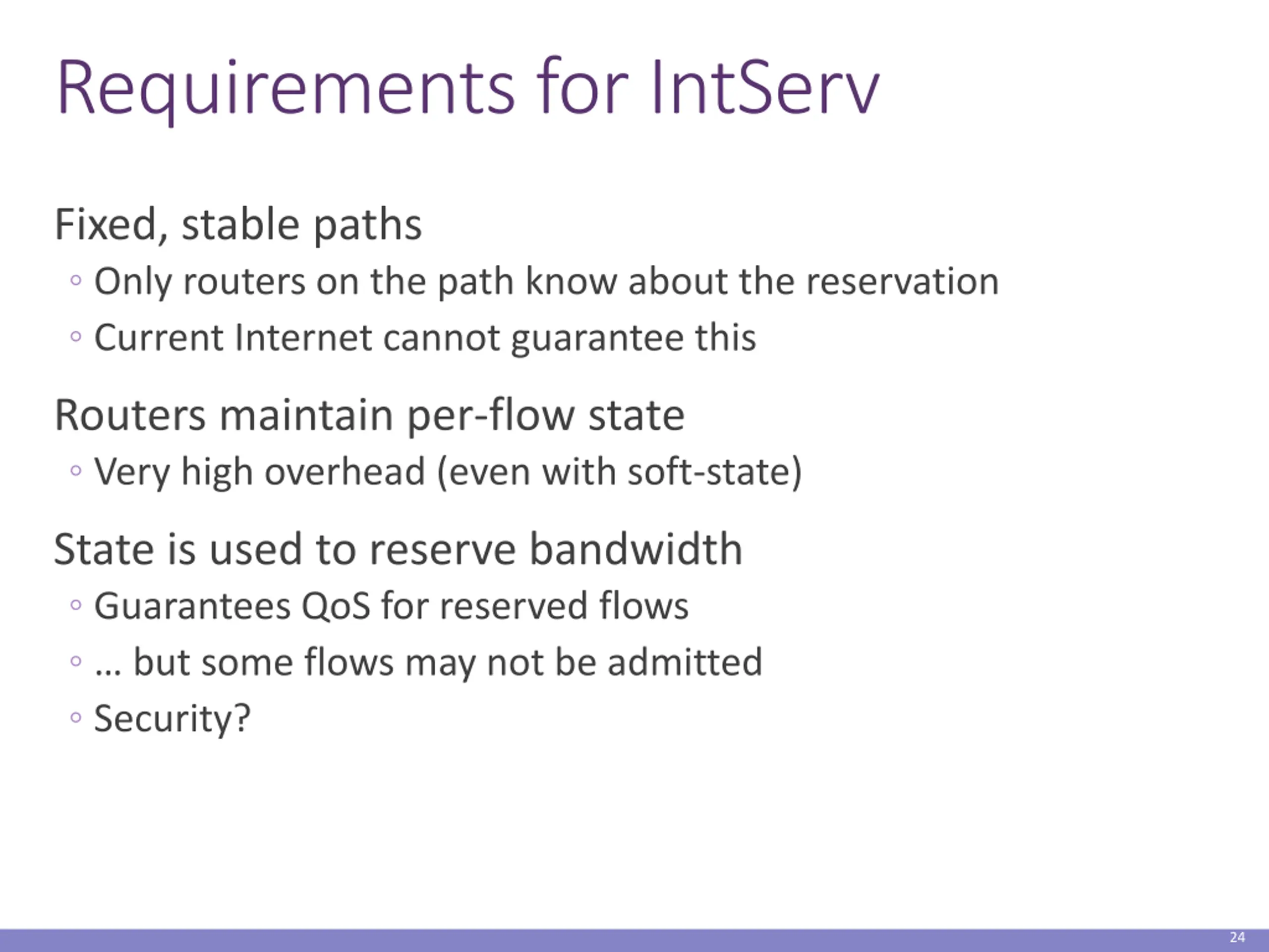 Requirements for IntServ Fixed, stable paths Only routers on the path know about the reservation Current Internet cannot guarantee this Routers maintain per-flow state Very high overhead (even with soft-state) State is used to reserve bandwidth Guarantees QoS for reserved flows but some flows may not be admitted Security? 24