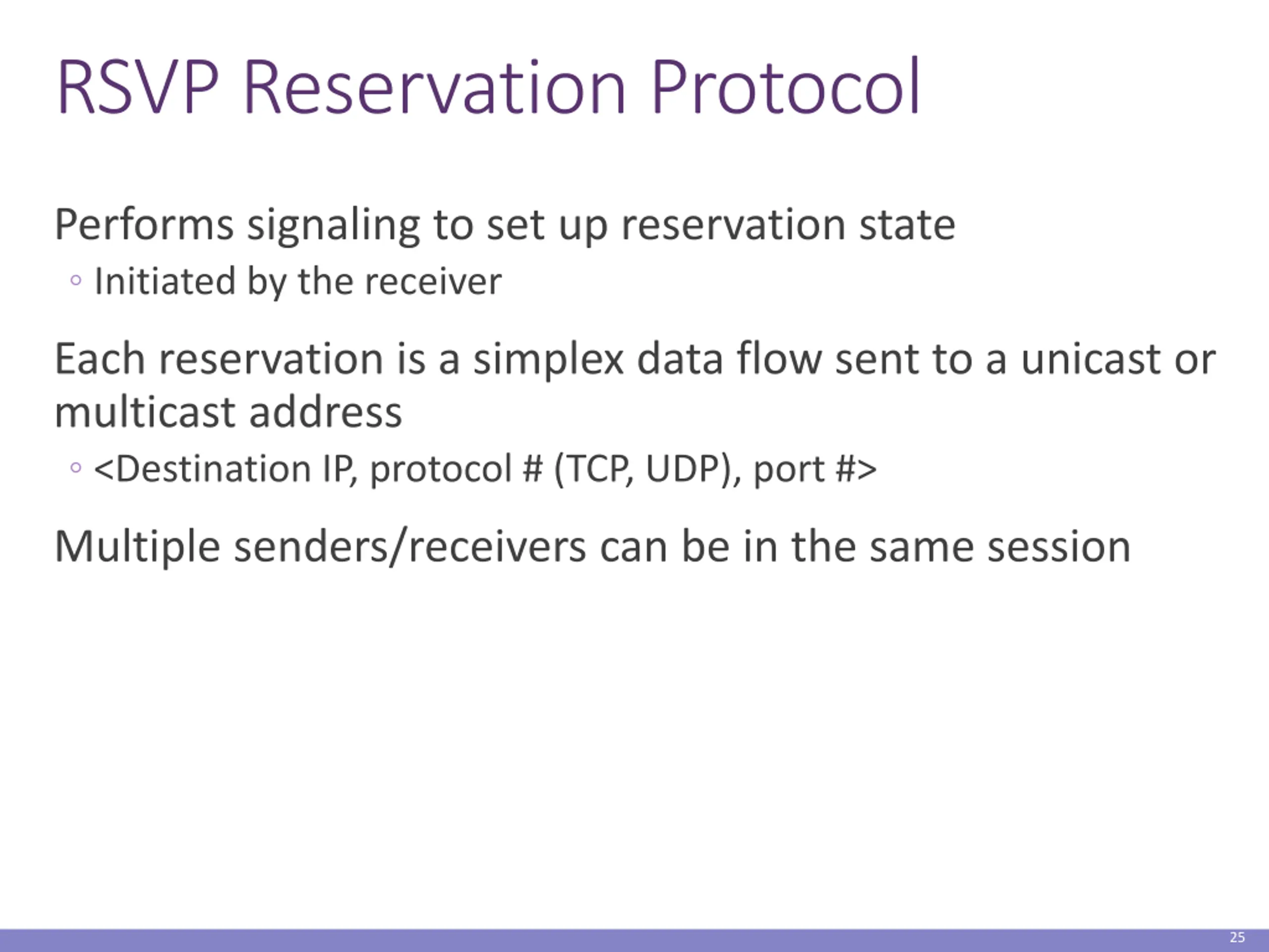 RSVP Reservation Protocol Performs signaling to set up reservation state Initiated by the receiver Each reservation is a simplex data flow sent to a unicast or multicast address <Destination IP, protocol # (TCP, UDP), port #> Multiple senders/receivers can be in the same session 25