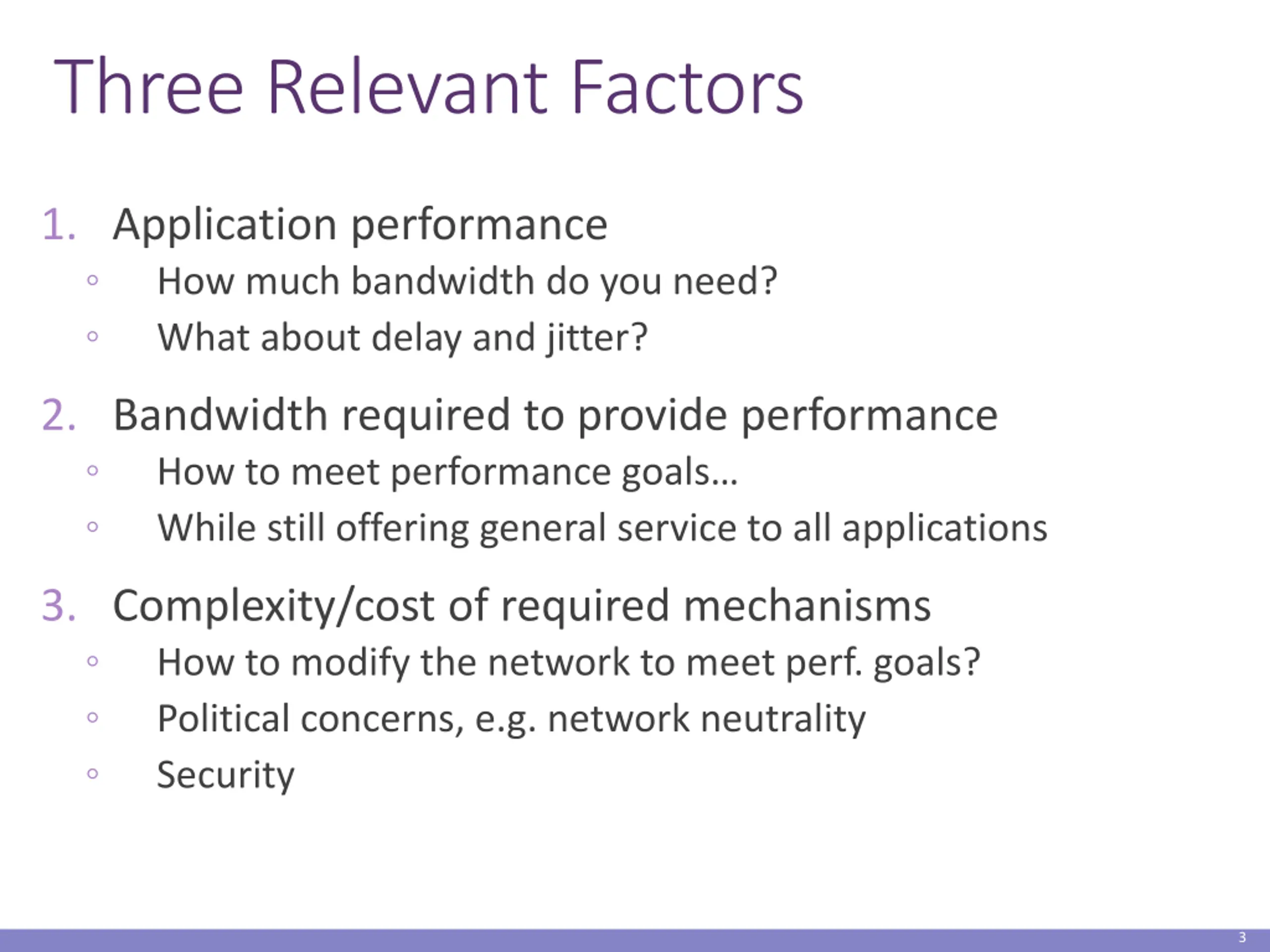 Three Relevant Factors 1. Application performance How much bandwidth do you need? What about delay and jitter? 2. Bandwidth required to provide performance How to meet performance goals While still offering general service to all applications 3. Complexity/cost of required mechanisms How to modify the network to meet perf. goals? Political concerns, e.g. network neutrality Security 3
