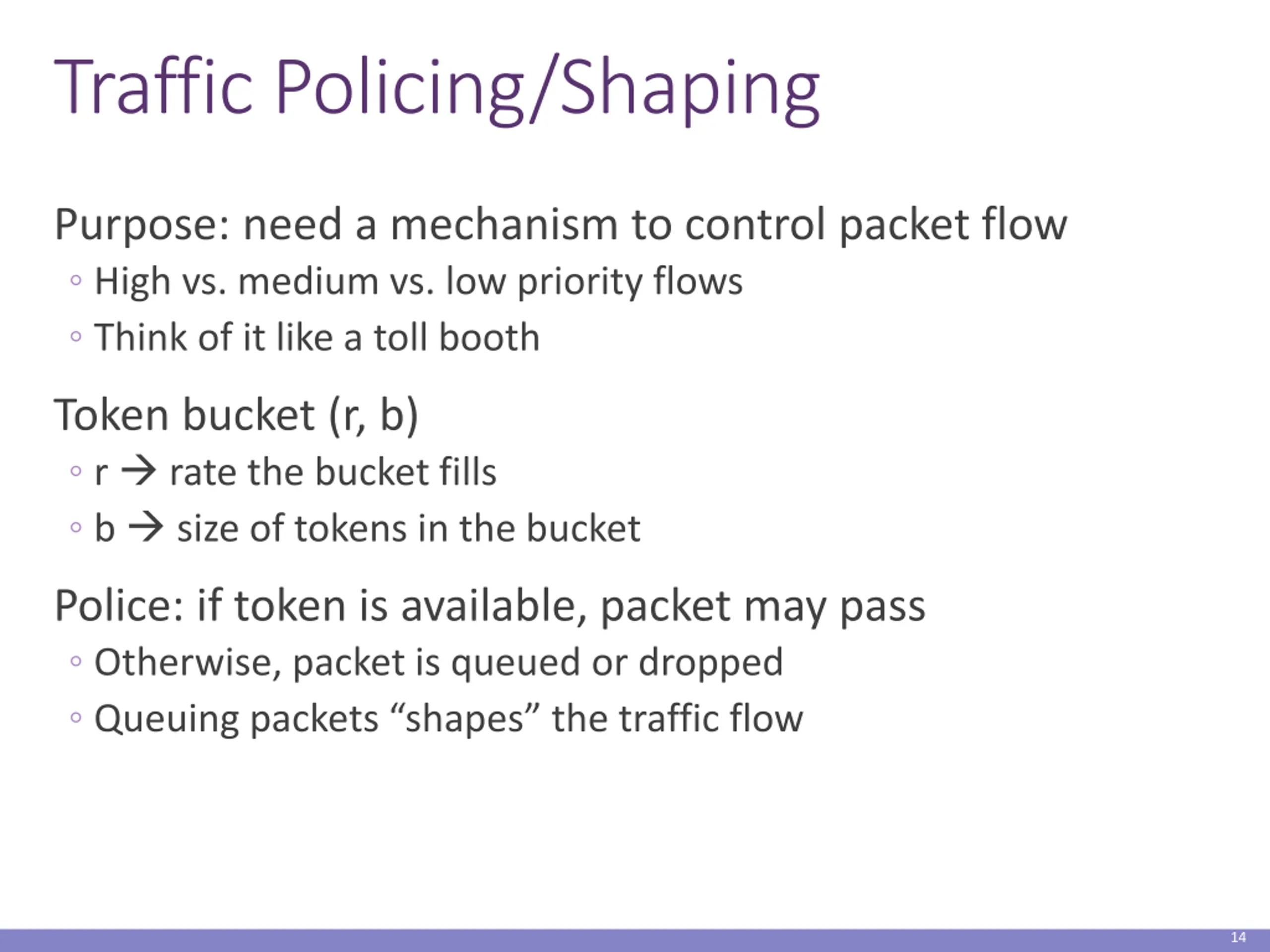 Traffic Policing/Shaping Purpose: need a mechanism to control packet flow High vs. medium vs. low priority flows Think of it like a toll booth Token bucket (r, b) r rate the bucket fills b size of tokens in the bucket Police: if token is available, packet may pass Otherwise, packet is queued or dropped Queuing packets shapes the traffic flow 14