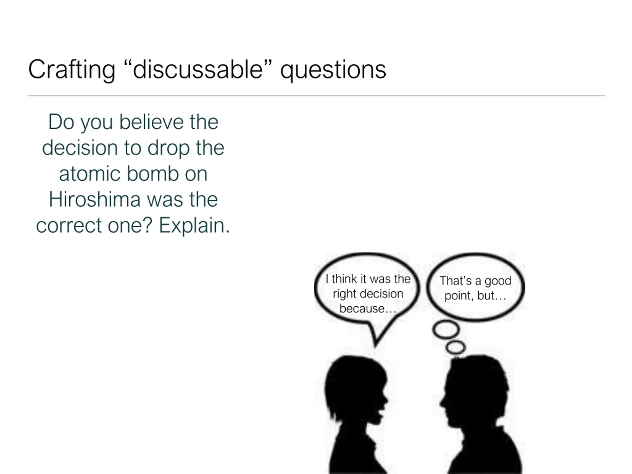 Crafting discussable questions Do you believe the decision to drop the atomic bomb on Hiroshima was the correct one? Explain. I think it was the right decision because That s a good point, but