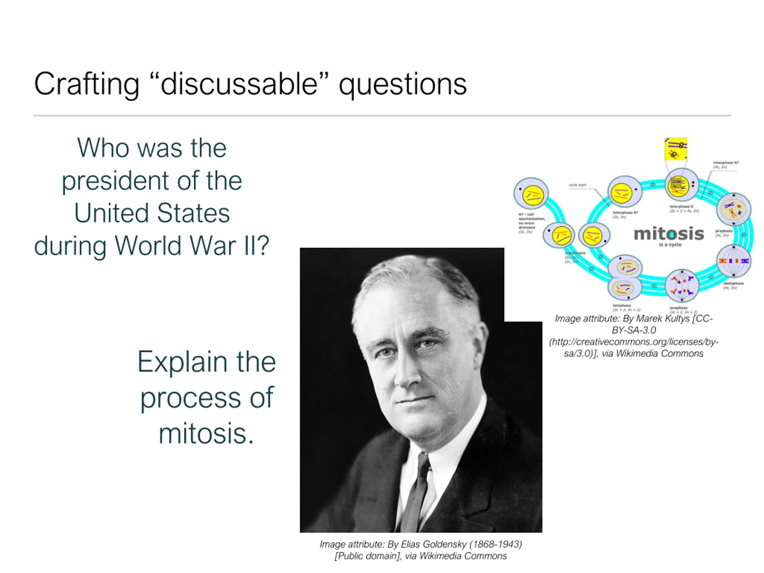 Crafting discussable questions Who was the president of the United States during World War II? Image attribute: By Marek Kultys [CC- BY-SA-3.0 (http://creativecommons.org/licenses/by- sa/3.0)], via Wikimedia Commons Explain the process of mitosis. Image attribute: By Elias Goldensky (1868-1943) [Public domain], via Wikimedia Commons
