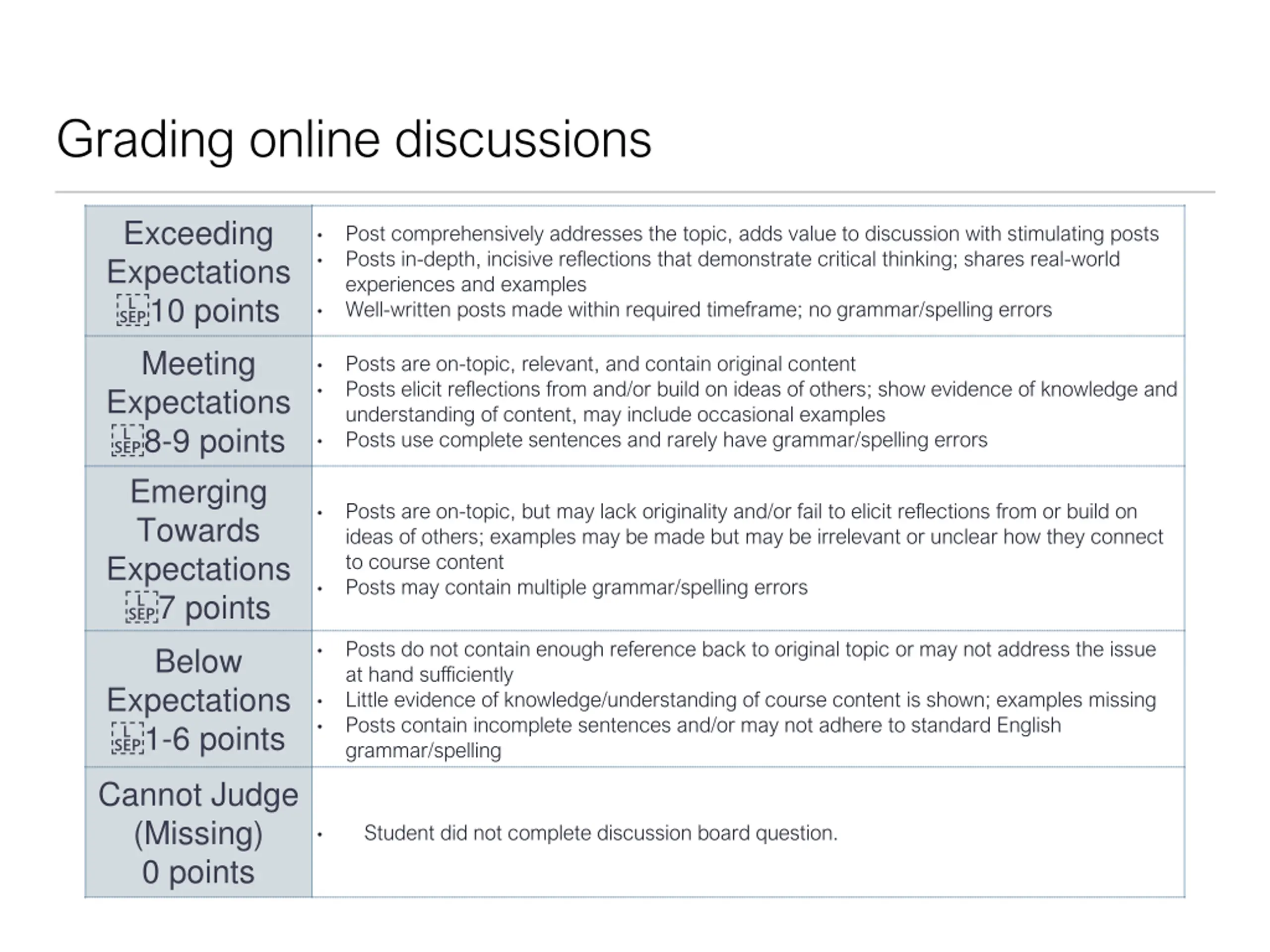 Grading online discussions Exceeding Expectations 10 points Meeting Expectations 8-9 points Emerging Towards Expectations 7 points Below Expectations 1-6 points Post comprehensively addresses the topic, adds value to discussion with stimulating posts Posts in-depth, incisive reflections that demonstrate critical thinking; shares real-world experiences and examples Well-written posts made within required timeframe; no grammar/spelling errors Posts are on-topic, relevant, and contain original content Posts elicit reflections from and/or build on ideas of others; show evidence of knowledge and understanding of content, may include occasional examples Posts use complete sentences and rarely have grammar/spelling errors Posts are on-topic, but may lack originality and/or fail to elicit reflections from or build on ideas of others; examples may be made but may be irrelevant or unclear how they connect to course content Posts may contain multiple grammar/spelling errors Posts do not contain enough reference back to original topic or may not address the issue at hand sufficiently Little evidence of knowledge/understanding of course content is shown; examples missing Posts contain incomplete sentences and/or may not adhere to standard English grammar/spelling Cannot Judge (Missing) 0 points Student did not complete discussion board question.