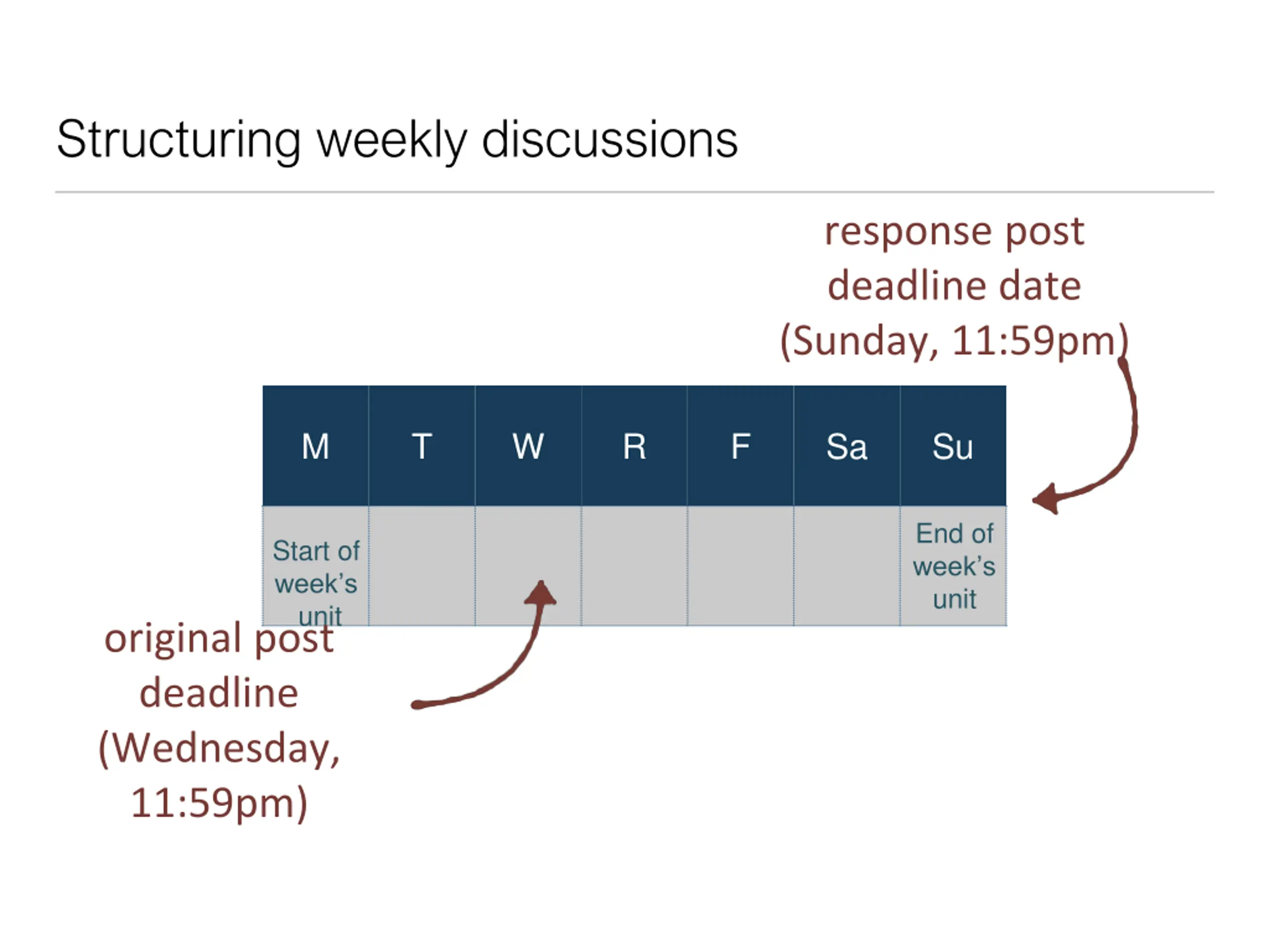 Structuring weekly discussions response post deadline date (Sunday, 11:59pm) M T W R F Sa Su End of week s unit Start of week s unit original post deadline (Wednesday, 11:59pm)