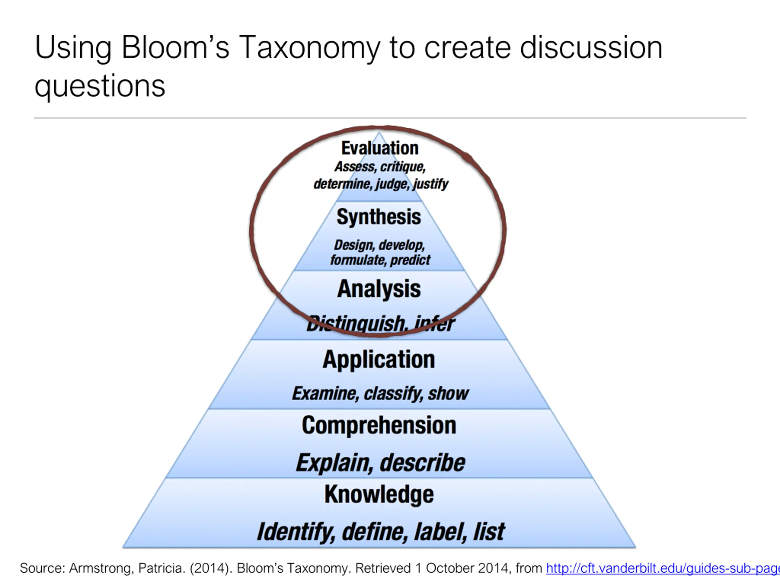 Using Blooms Taxonomy to create discussion questions Source: Armstrong, Patricia. (2014). Bloom s Taxonomy. Retrieved 1 October 2014, from http://cft.vanderbilt.edu/guides-sub-pages/blooms