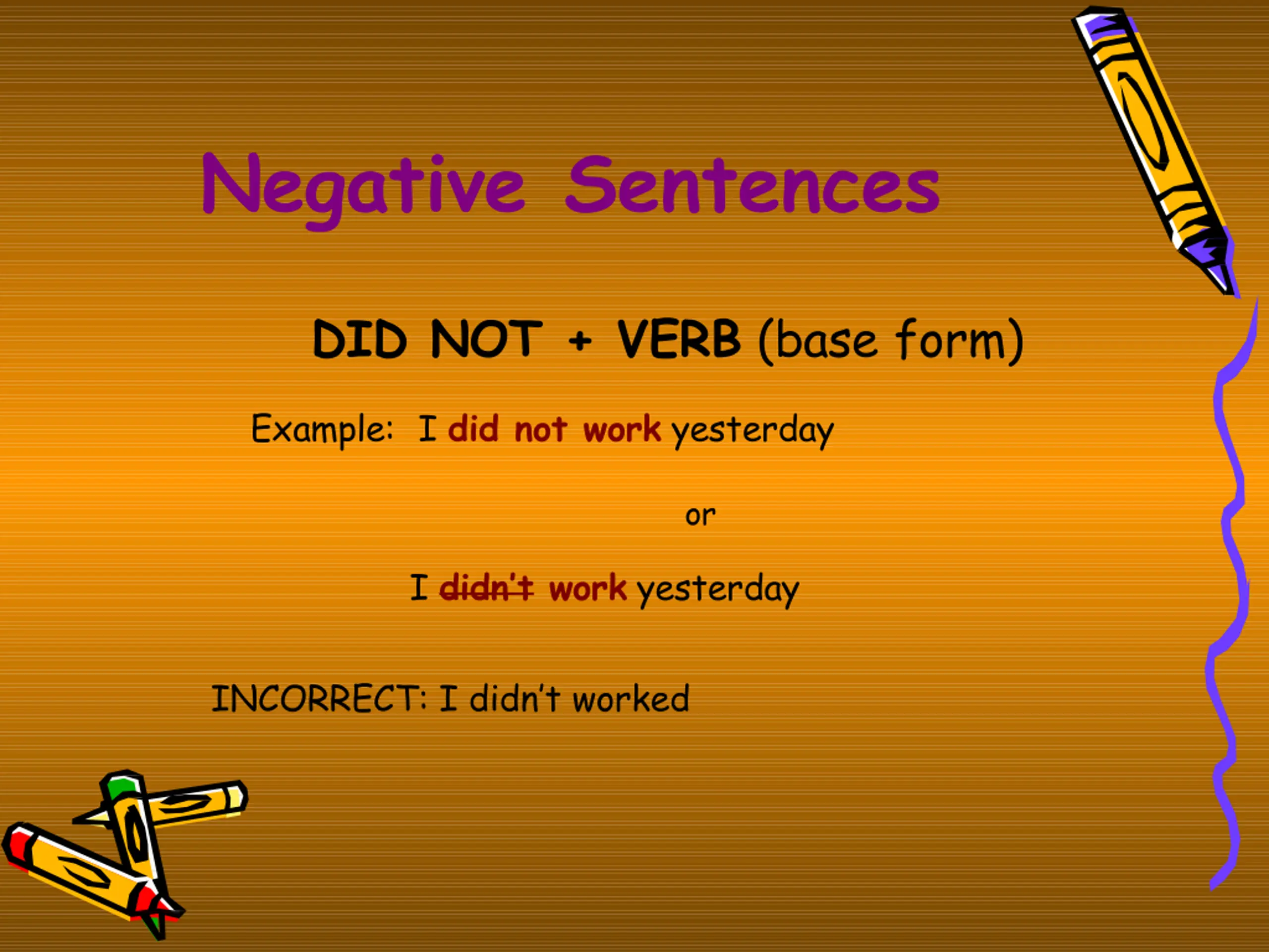 Negative Sentences DID NOT + VERB (base form) Example: I did not work yesterday or I didn t work yesterday INCORRECT: I didn t worked
