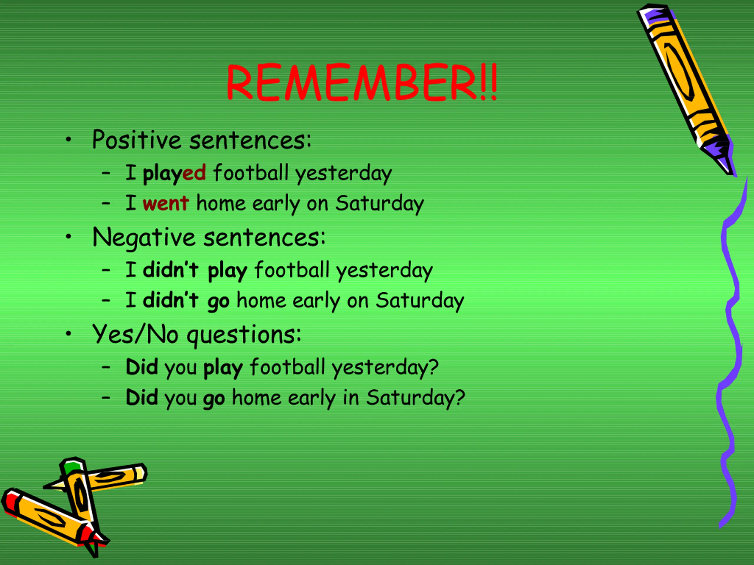 REMEMBER!! Positive sentences: I played football yesterday I went home early on Saturday Negative sentences: I didn t play football yesterday I didn t go home early on Saturday Yes/No questions: Did you play football yesterday? Did you go home early in Saturday?