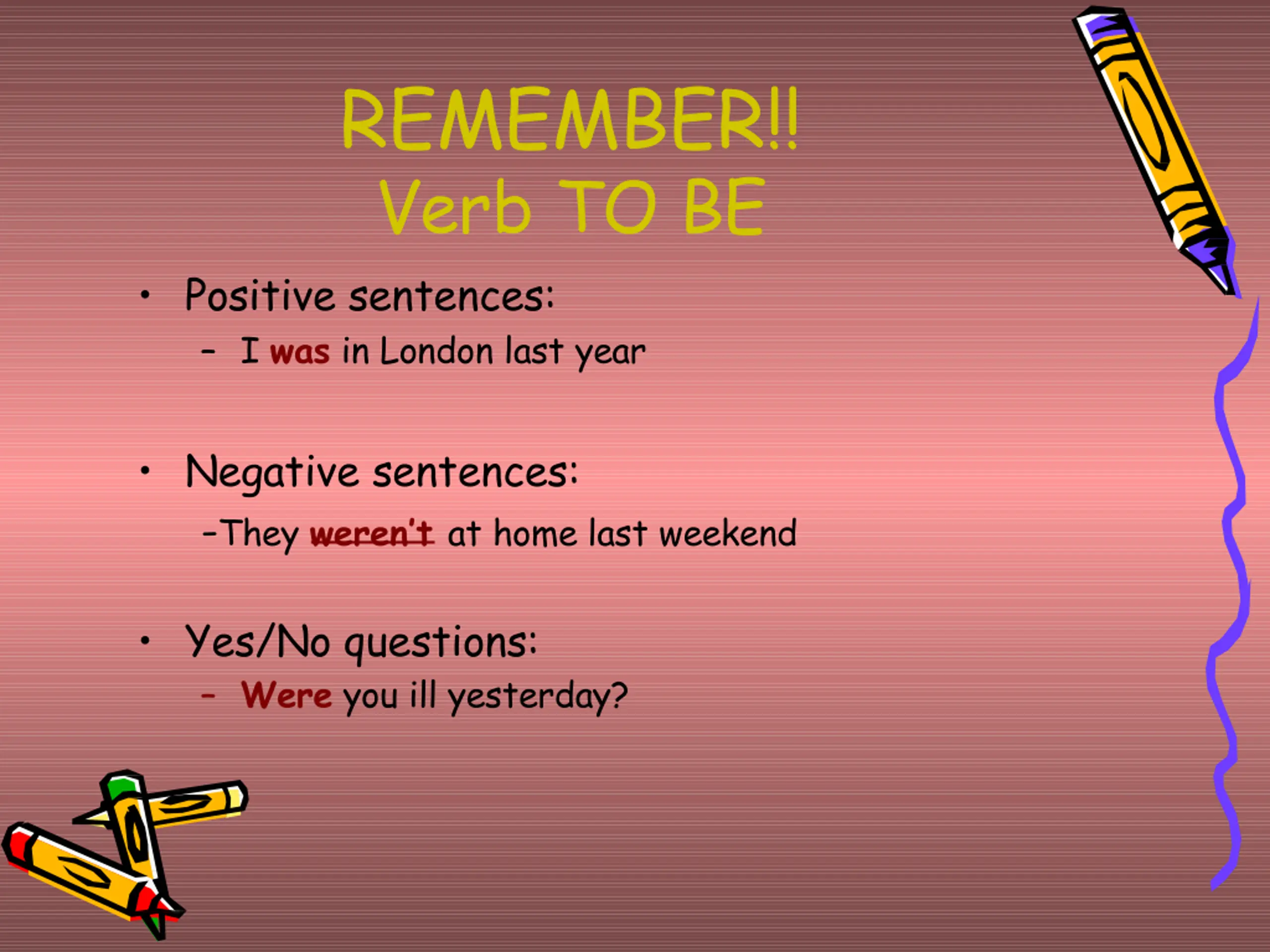 REMEMBER!! Verb TO BE Positive sentences: I was in London last year Negative sentences: -They weren t at home last weekend Yes/No questions: Were you ill yesterday?