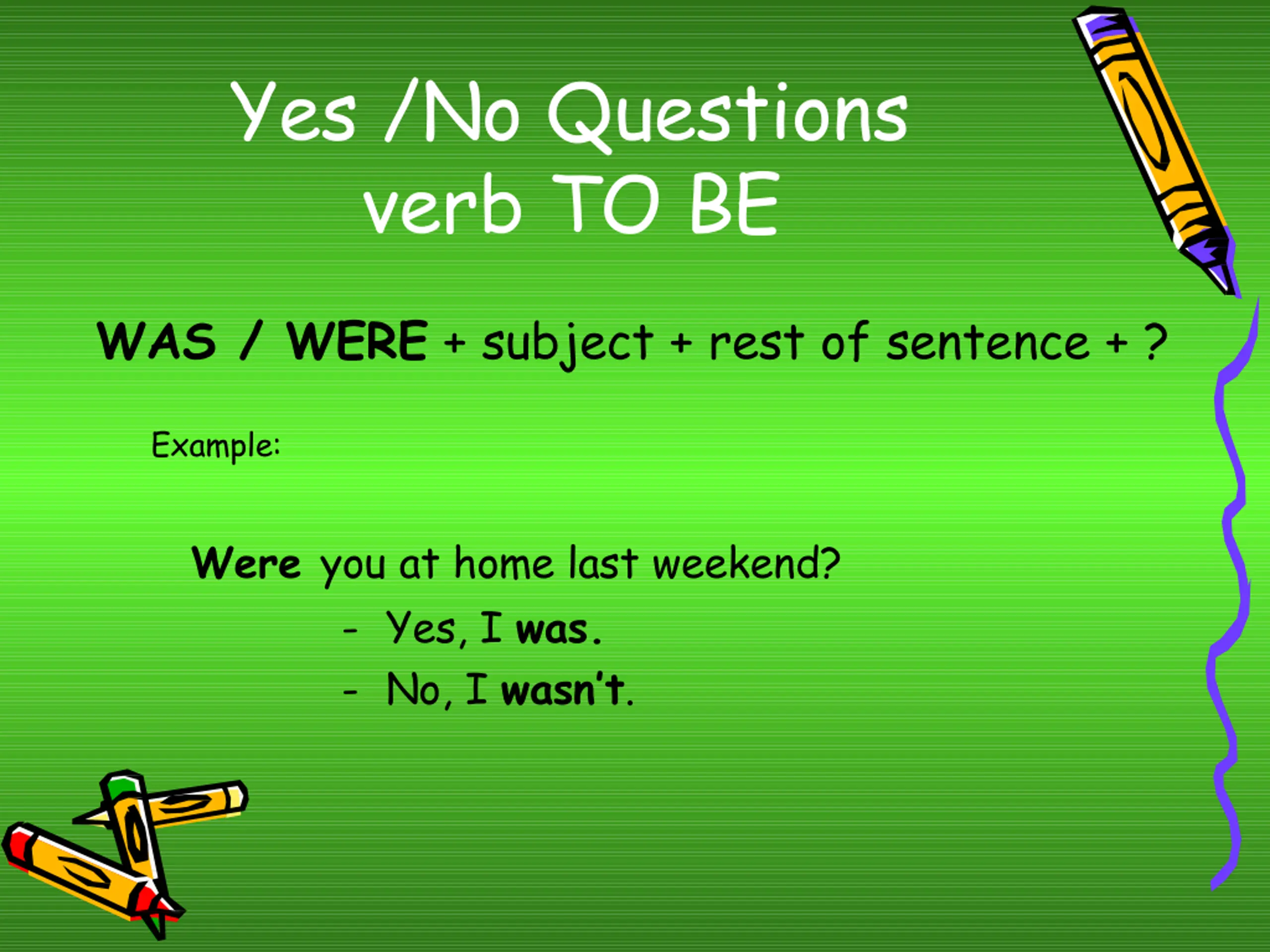 Yes /No Questions verb TO BE WAS / WERE + subject + rest of sentence + ? Example: Were you at home last weekend? - Yes, I was. - No, I wasn t.