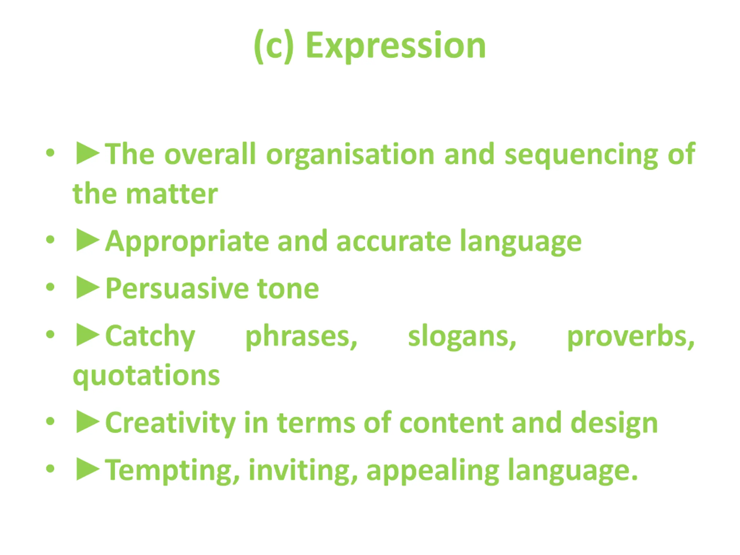 (c) Expression The overall organisation and sequencing of the matter Appropriate and accurate language Persuasive tone Catchy phrases, quotations Creativity in terms of content and design Tempting, inviting, appealing language. slogans, proverbs,