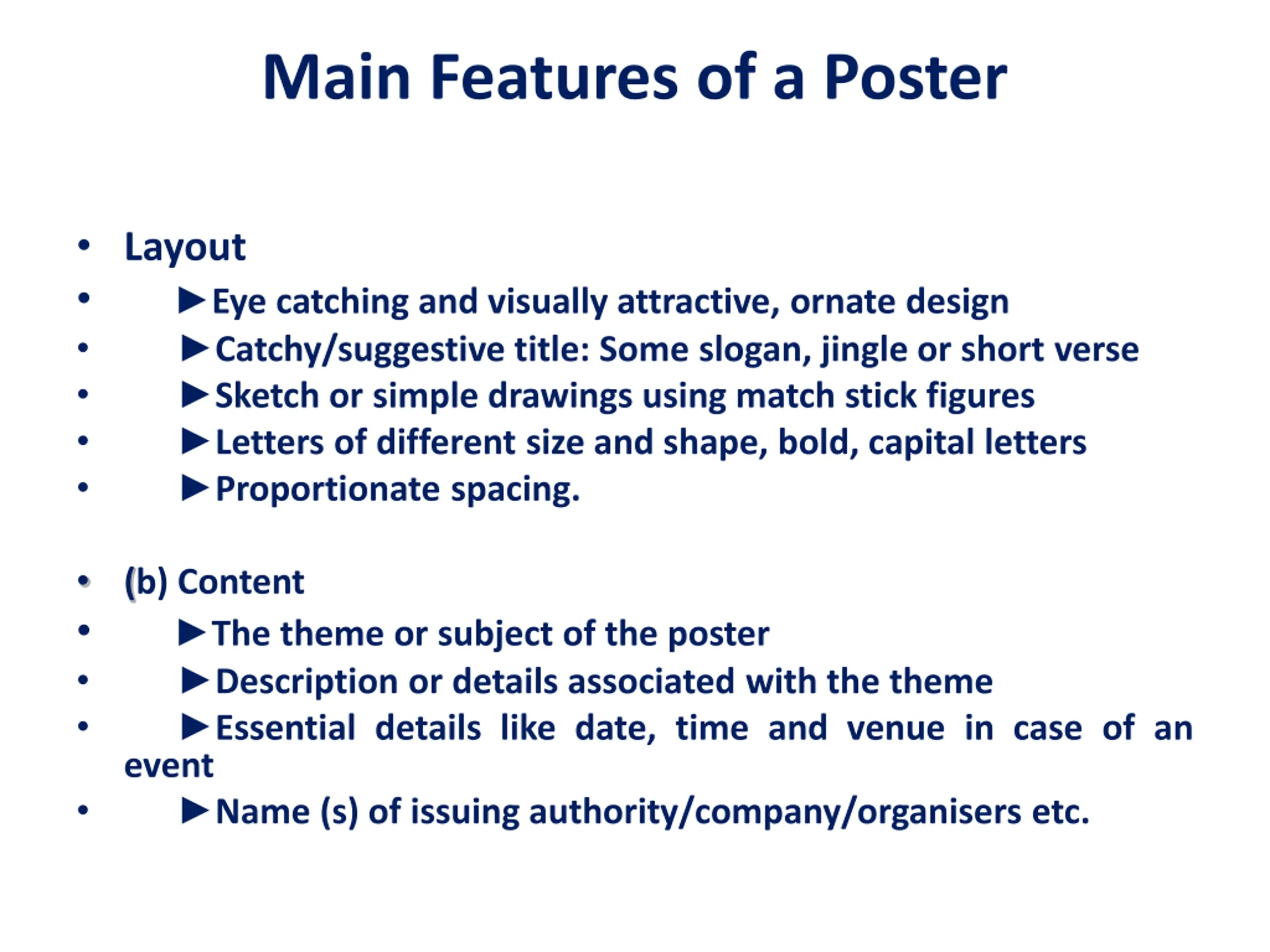 Main Features of a Poster Layout Eye catching and visually attractive, ornate design Catchy/suggestive title: Some slogan, jingle or short verse Sketch or simple drawings using match stick figures Letters of different size and shape, bold, capital letters Proportionate spacing. (b) Content The theme or subject of the poster Description or details associated with the theme Essential details like date, time and venue in case of an event Name (s) of issuing authority/company/organisers etc.