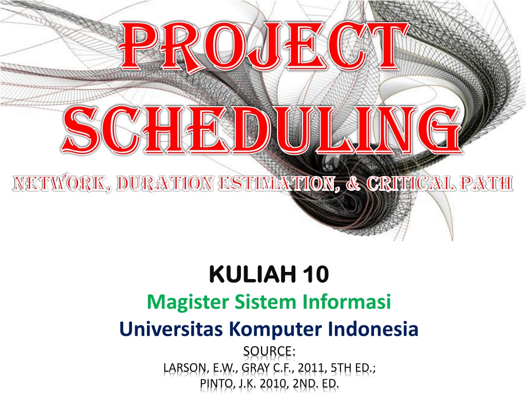 Project Project Scheduling Scheduling NETWORK, DURATION ESTIMATION, & CRITICAL PATH NETWORK, DURATION ESTIMATION, & CRITICAL PATH KULIAH 10 KULIAH 10 Magister Sistem Informasi Universitas Komputer Indonesia SOURCE: LARSON, E.W., GRAY C.F., 2011, 5TH ED.; PINTO, J.K. 2010, 2ND. ED.