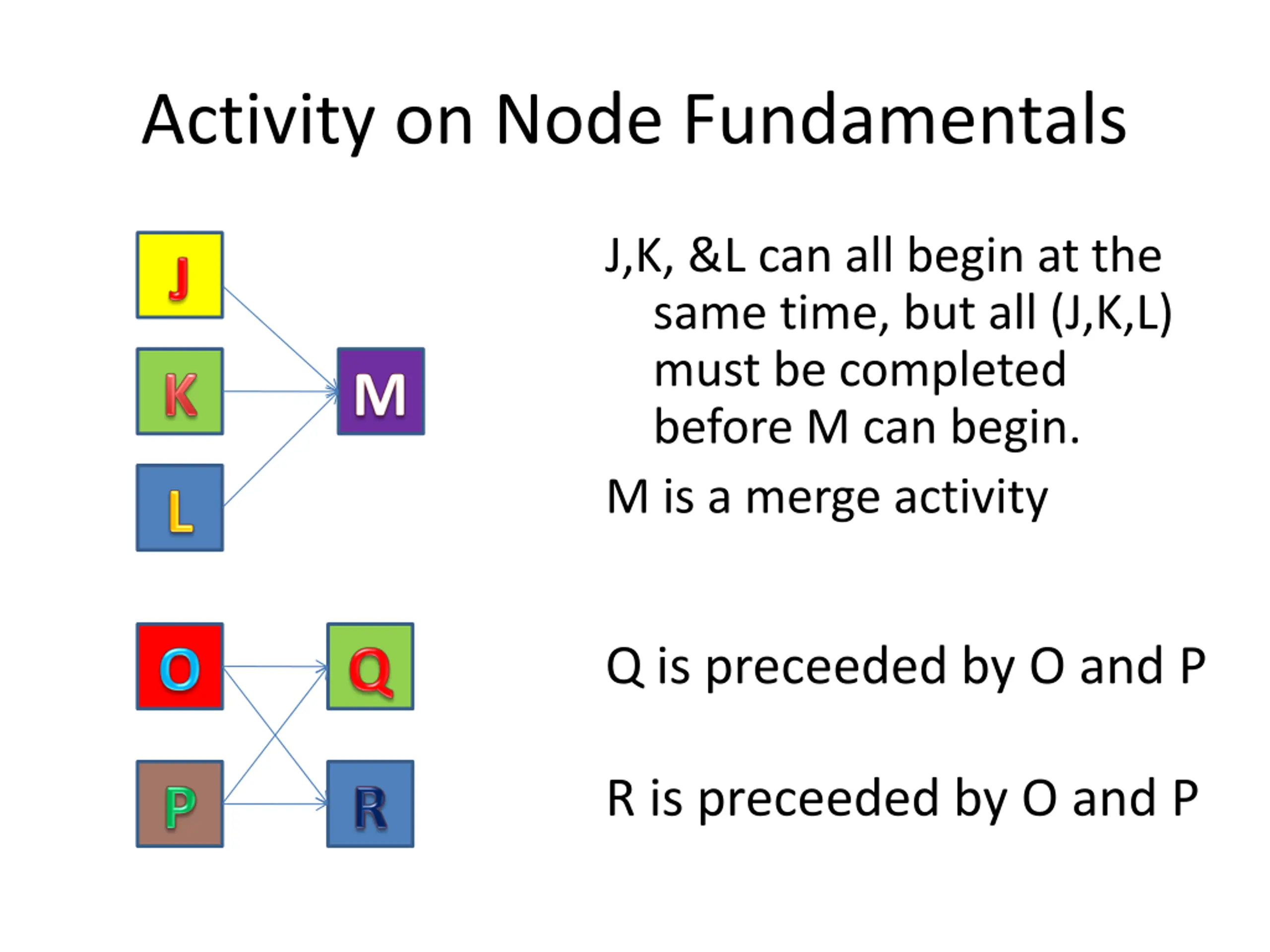 Activity on Node Fundamentals J,K, &L can all begin at the same time, but all (J,K,L) must be completed before M can begin. M is a merge activity Q is preceeded by O and P R is preceeded by O and P