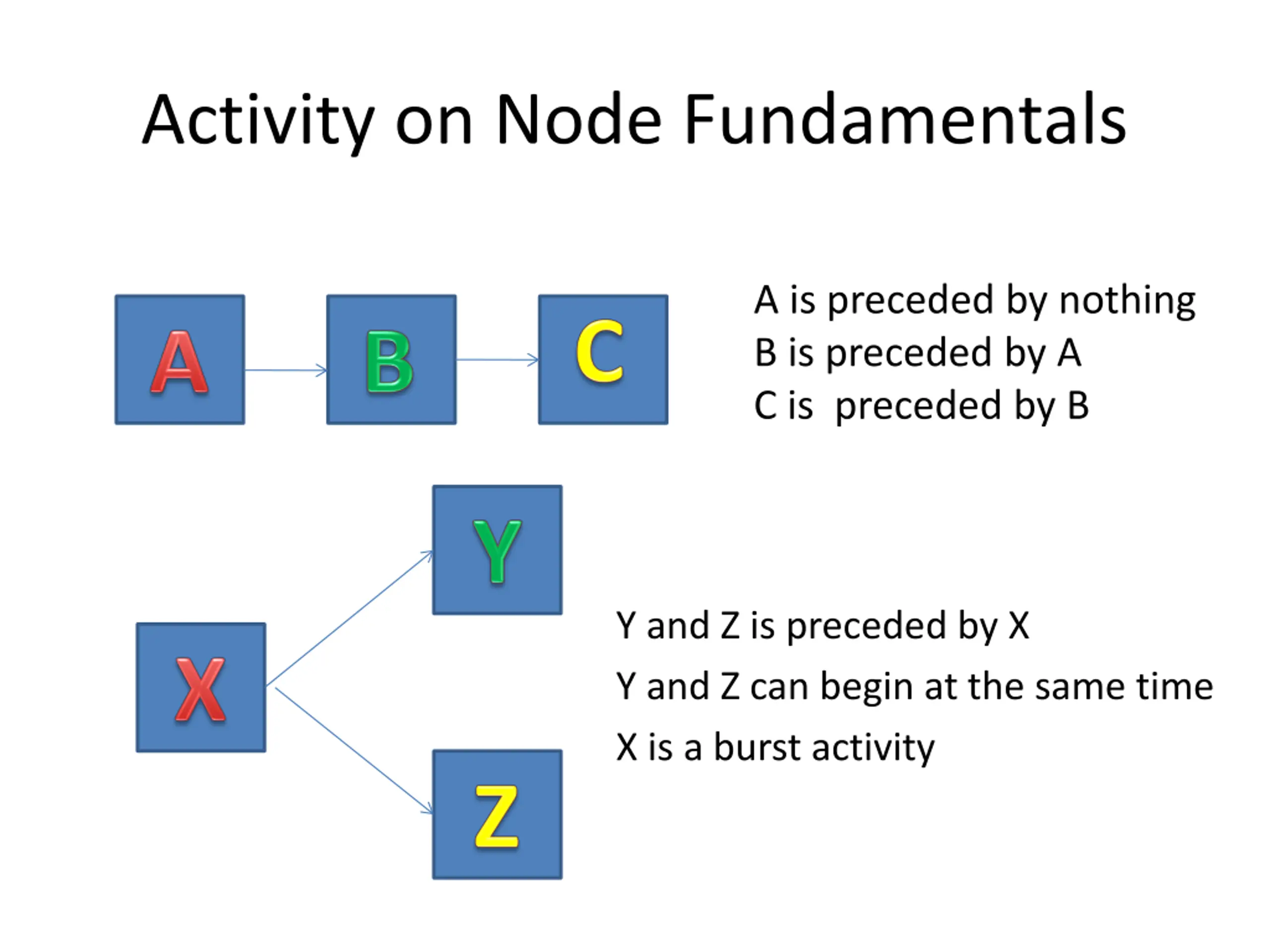 Activity on Node Fundamentals A is preceded by nothing B is preceded by A C is preceded by B Y and Z is preceded by X Y and Z can begin at the same time X is a burst activity