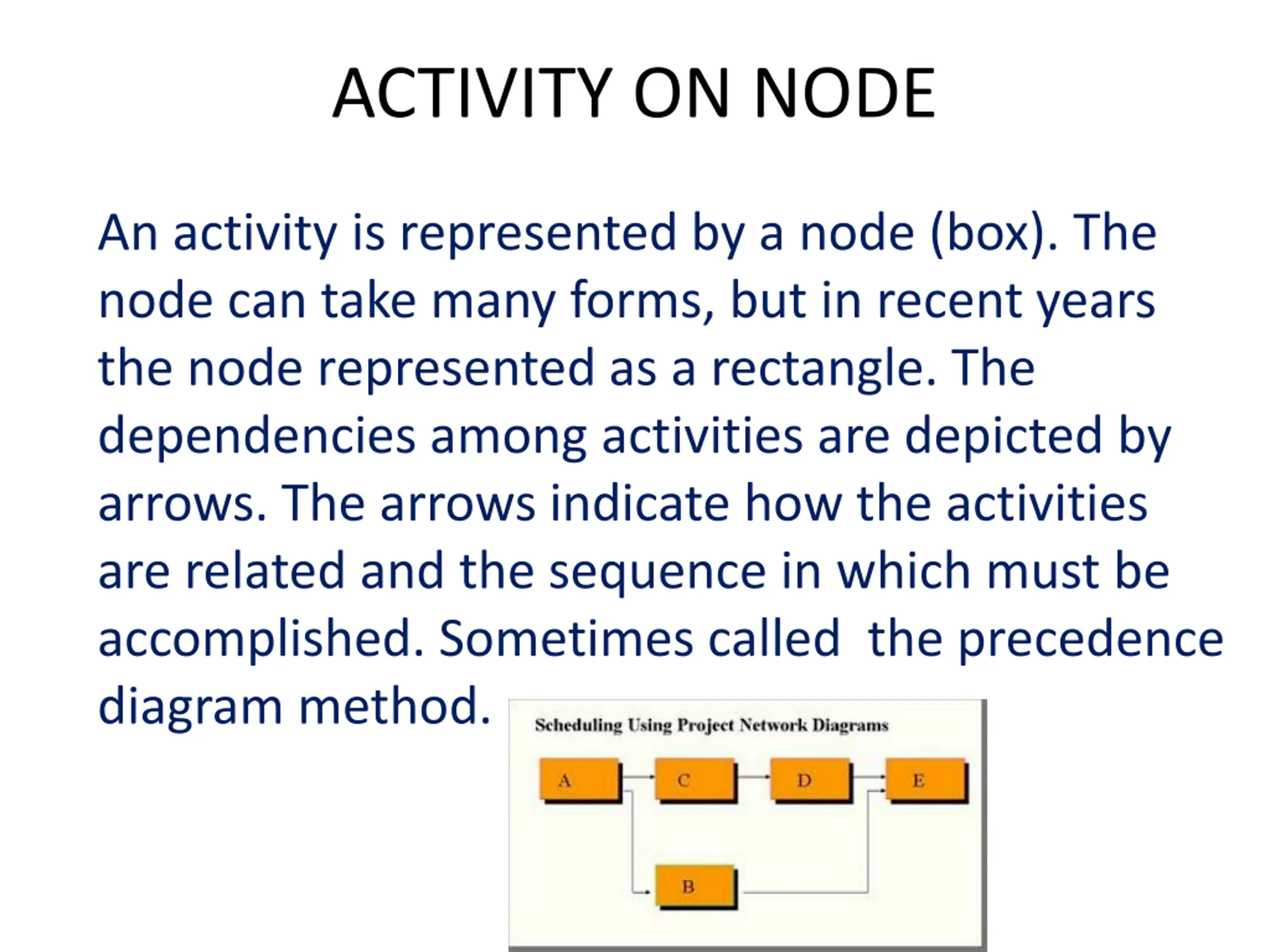 ACTIVITY ON NODE An activity is represented by a node (box). The node can take many forms, but in recent years the node represented as a rectangle. The dependencies among activities are depicted by arrows. The arrows indicate how the activities are related and the sequence in which must be accomplished. Sometimes called the precedence diagram method.