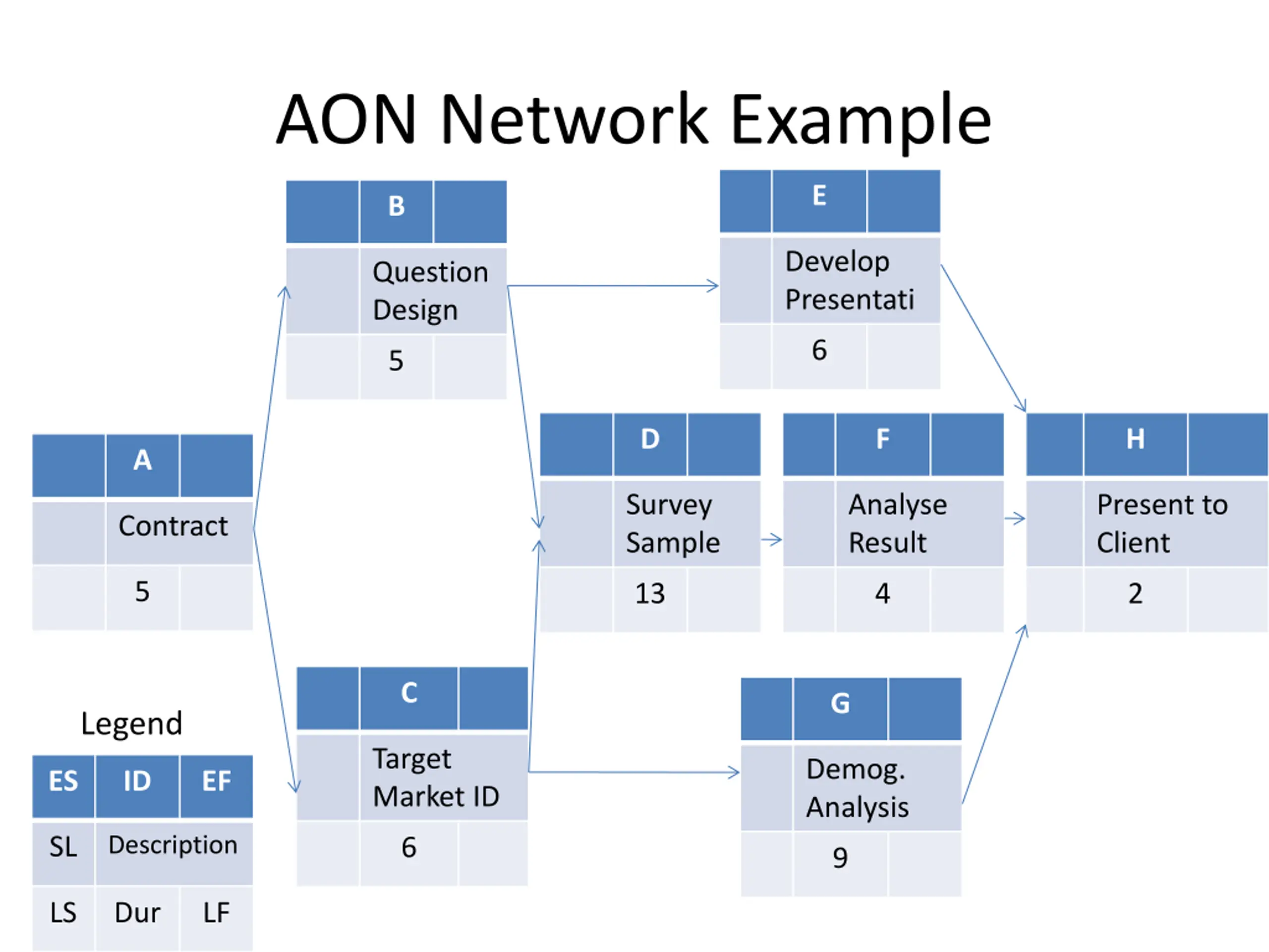 AON Network Example E B Develop Presentati Question Design 6 5 D F H A Survey Sample Analyse Result Present to Client Contract 5 13 4 2 C G Legend Target Market ID Demog. Analysis ES ID EF Description SL 6 9 LS Dur LF