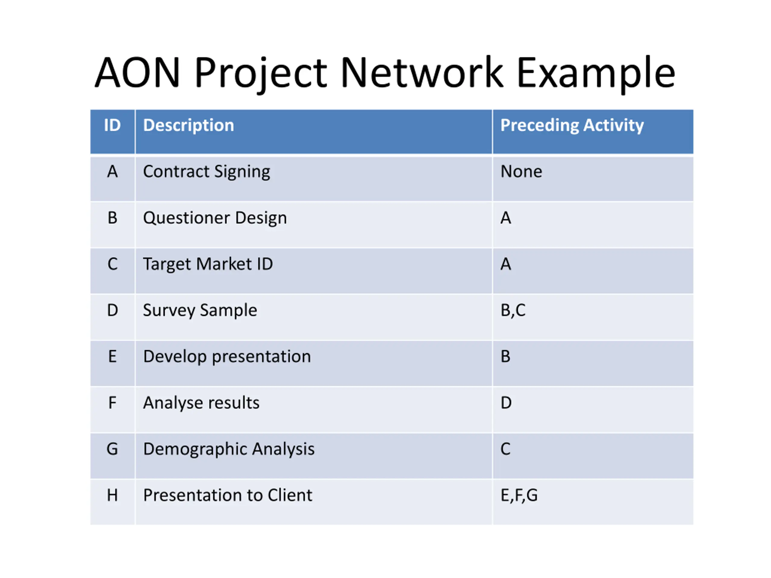 AON Project Network Example ID Description Preceding Activity A Contract Signing None B Questioner Design A C Target Market ID A D Survey Sample B,C E Develop presentation B F Analyse results D G Demographic Analysis C H Presentation to Client E,F,G
