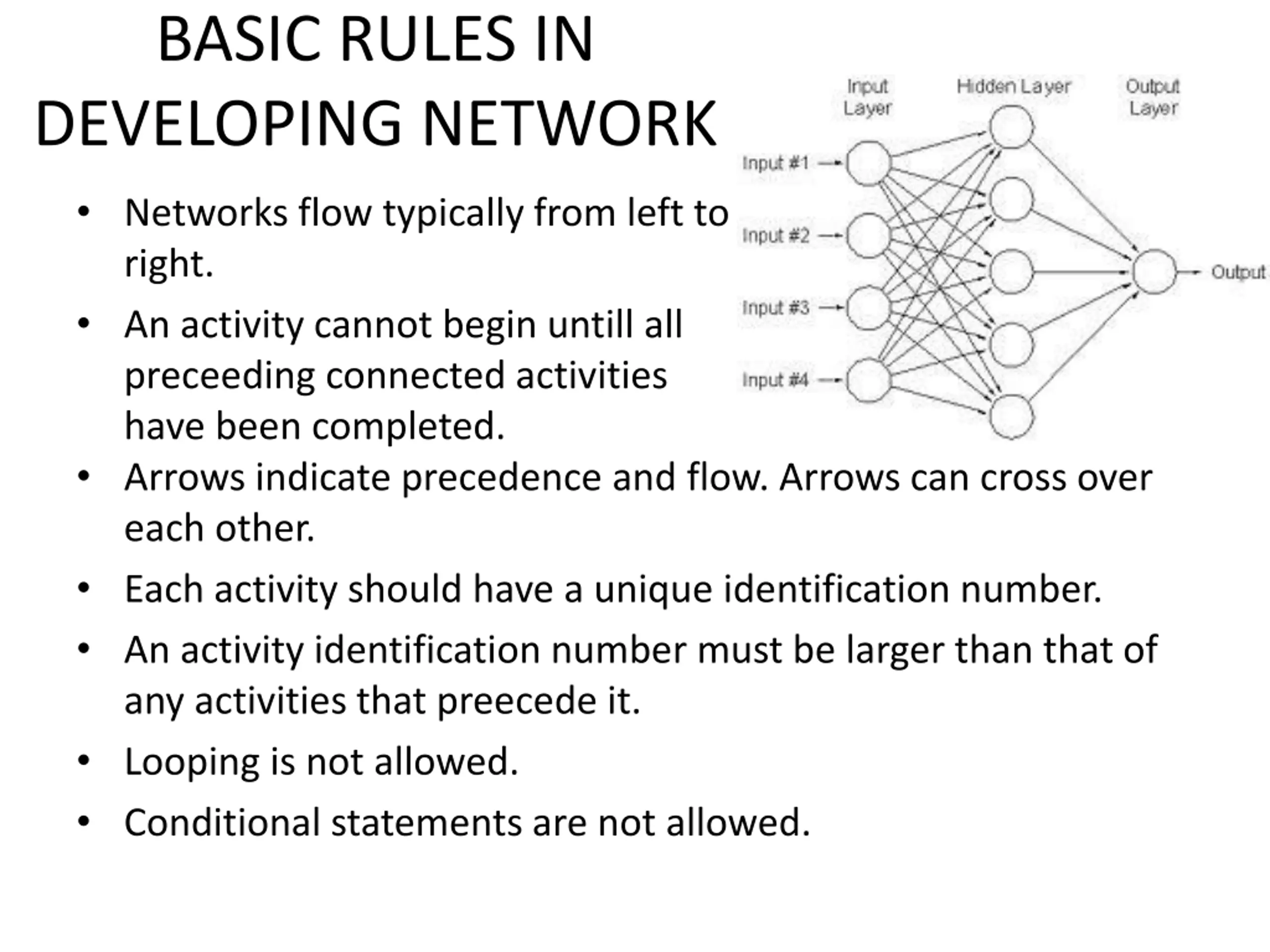 BASIC RULES IN DEVELOPING NETWORK Networks flow typically from left to right. An activity cannot begin untill all preceeding connected activities have been completed. Arrows indicate precedence and flow. Arrows can cross over each other. Each activity should have a unique identification number. An activity identification number must be larger than that of any activities that preecede it. Looping is not allowed. Conditional statements are not allowed.