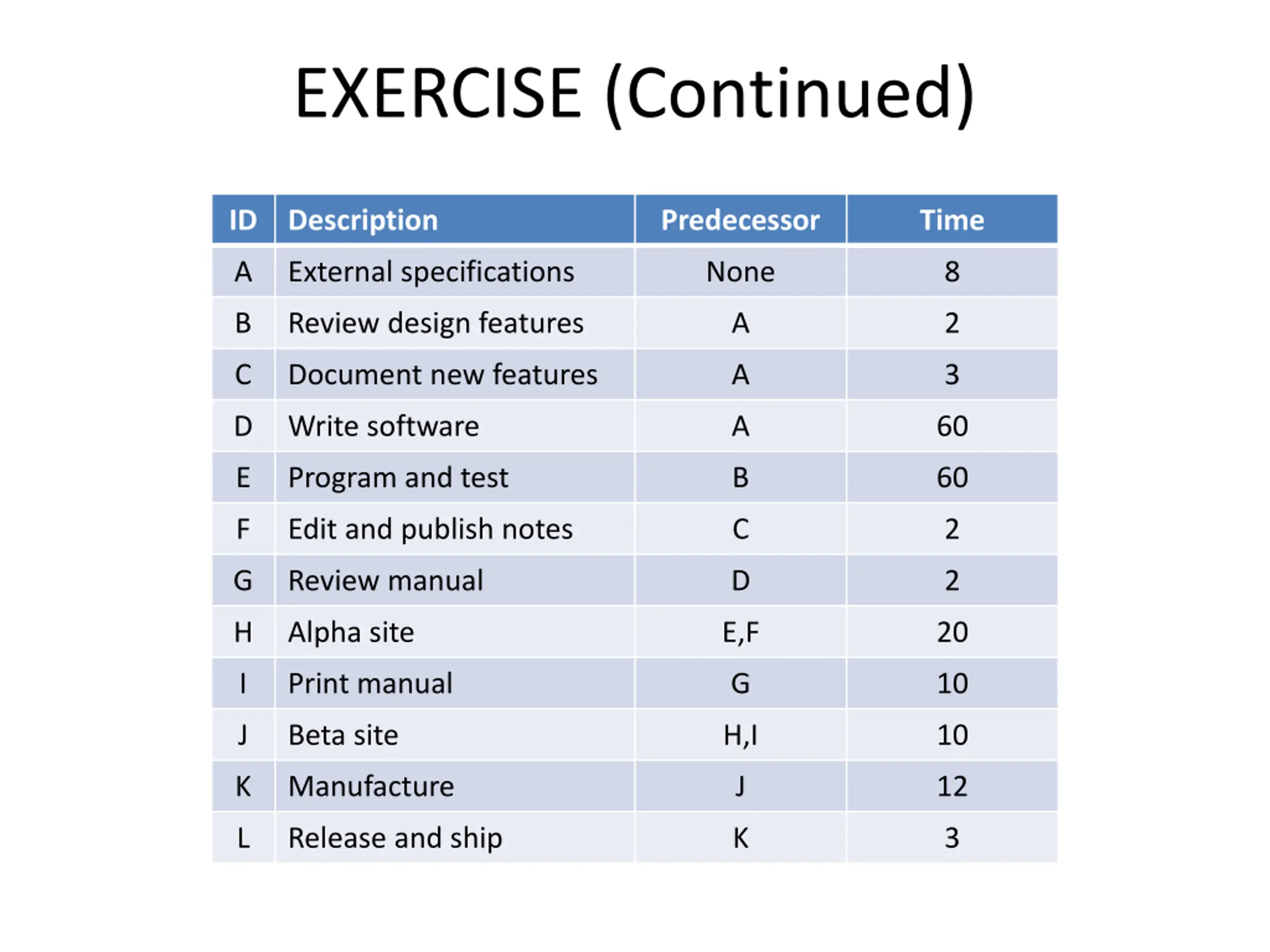 EXERCISE (Continued) ID Description Predecessor Time A External specifications None 8 B Review design features A 2 C Document new features A 3 D Write software A 60 E Program and test B 60 F Edit and publish notes C 2 G Review manual D 2 H Alpha site E,F 20 I Print manual G 10 J Beta site H,I 10 K Manufacture J 12 L Release and ship K 3