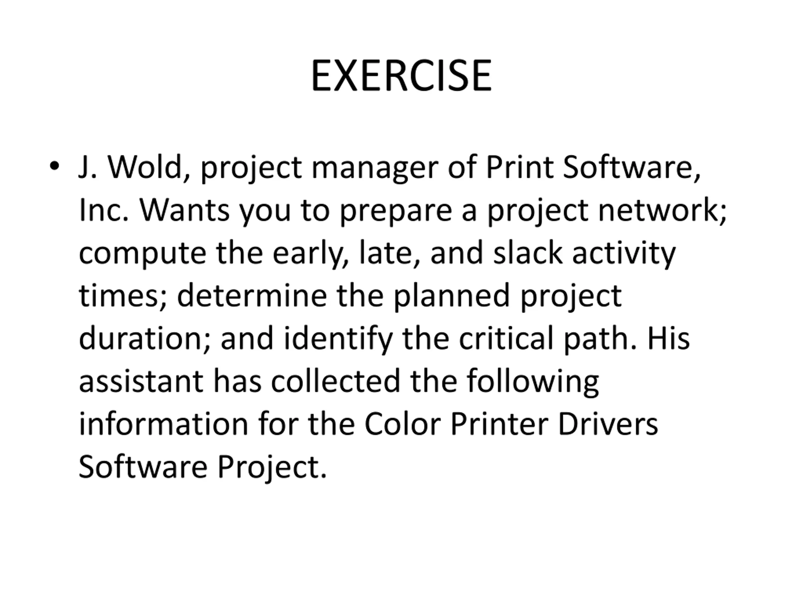 EXERCISE J. Wold, project manager of Print Software, Inc. Wants you to prepare a project network; compute the early, late, and slack activity times; determine the planned project duration; and identify the critical path. His assistant has collected the following information for the Color Printer Drivers Software Project.