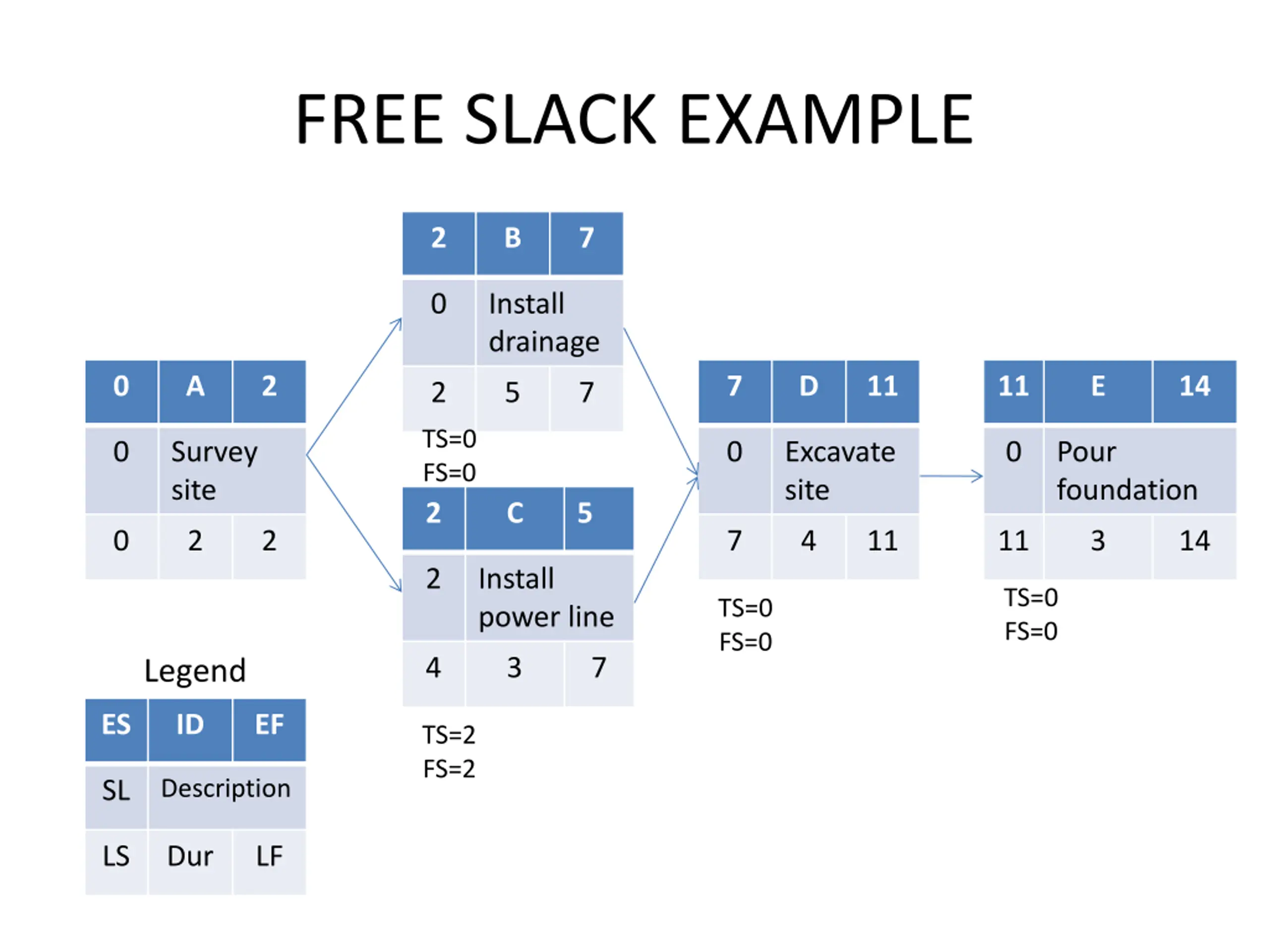 FREE SLACK EXAMPLE 2 B 7 0 Install drainage 0 A 2 7 D 11 11 E 14 2 5 7 TS=0 FS=0 0 Survey site 0 Excavate site 0 Pour foundation 2 C 5 0 2 2 7 4 11 11 3 14 2 Install power line TS=0 FS=0 TS=0 FS=0 4 3 7 Legend ES ID EF TS=2 FS=2 Description SL LS Dur LF