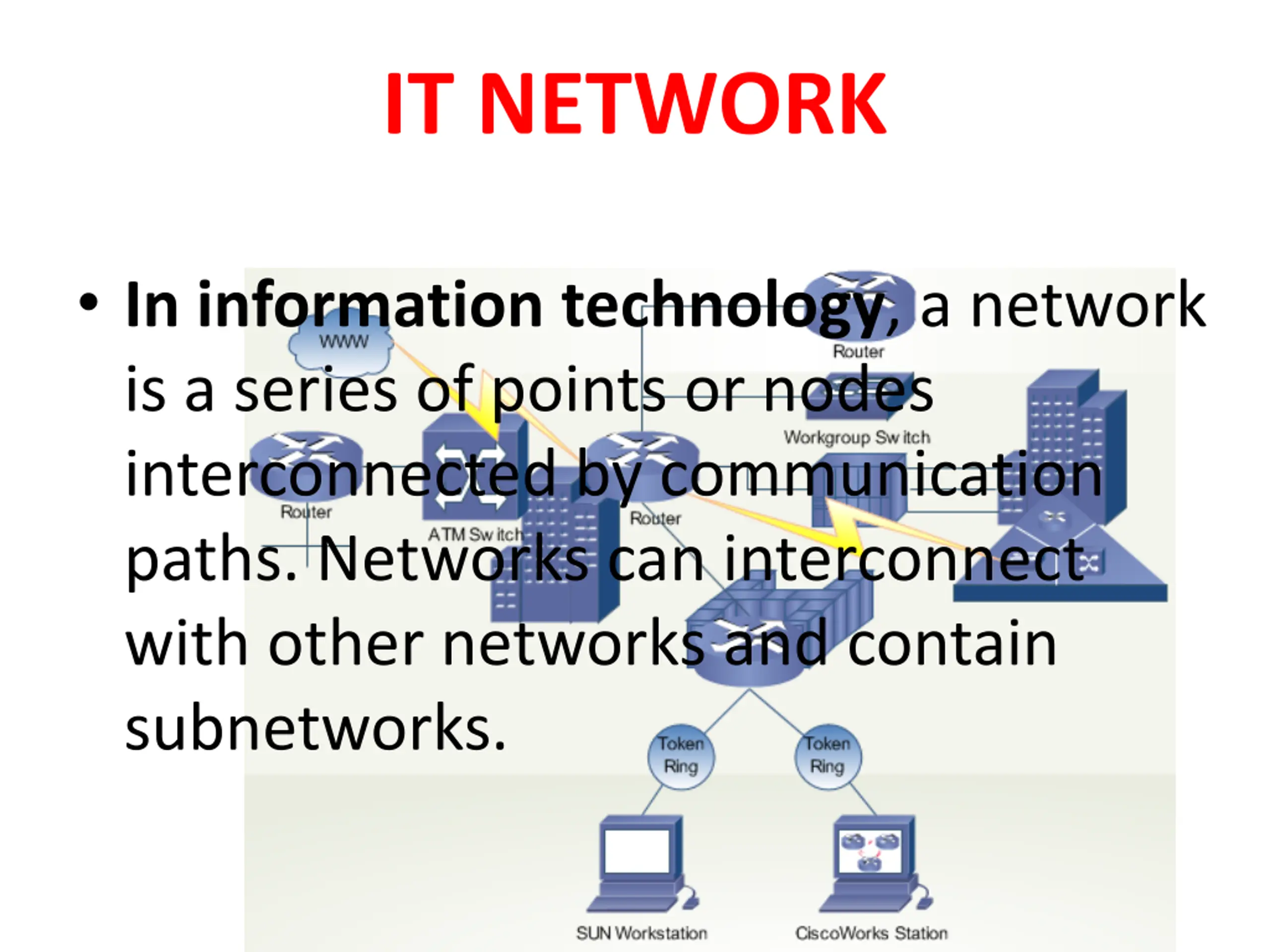 IT NETWORK In information technology, a network is a series of points or nodes interconnected by communication paths. Networks can interconnect with other networks and contain subnetworks.