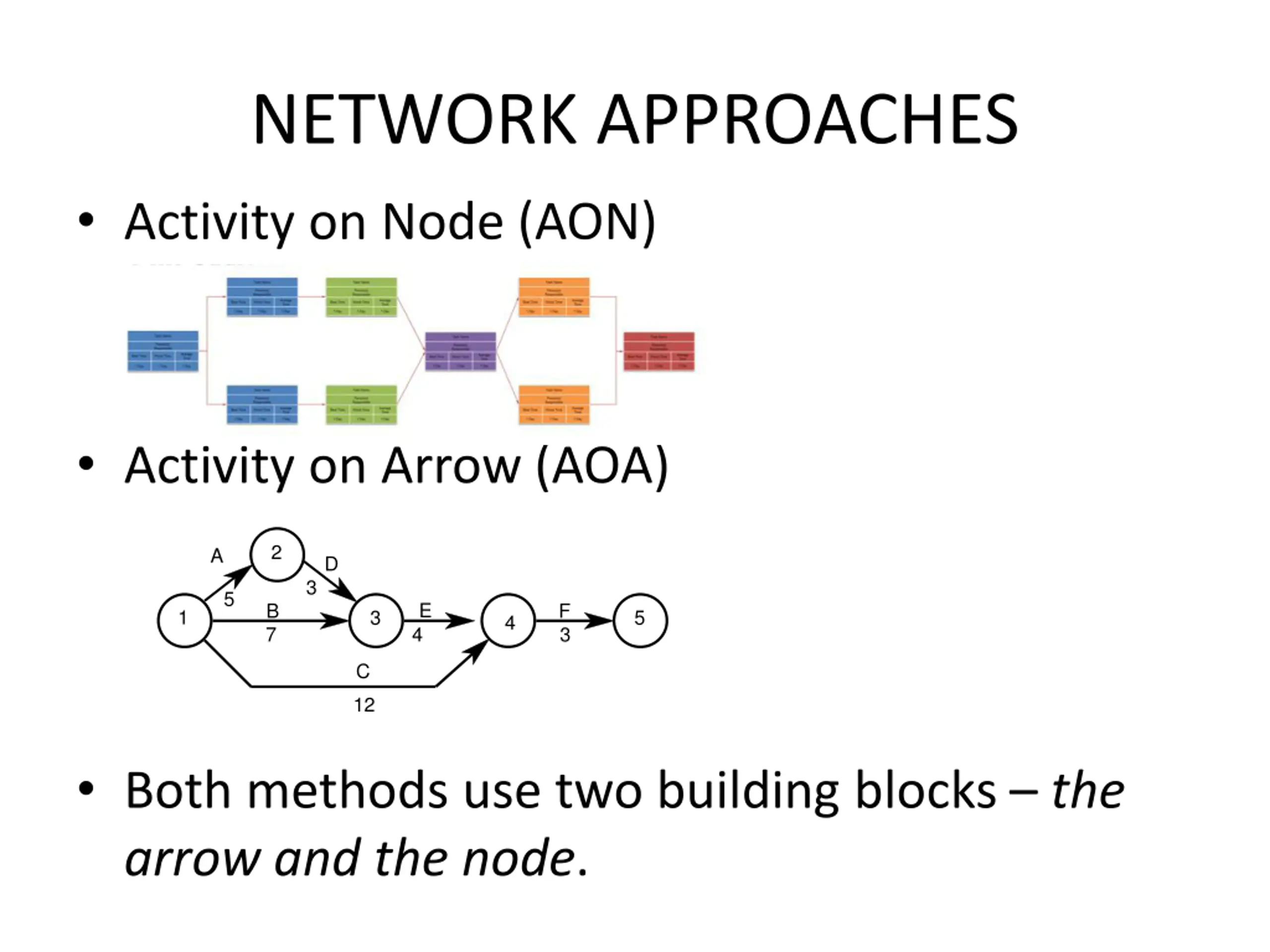 NETWORK APPROACHES Activity on Node (AON) Activity on Arrow (AOA) 2 A D 3 5 E B 7 F 3 1 3 5 4 4 1 C 1 1 12 Both methods use two building blocks the arrow and the node.