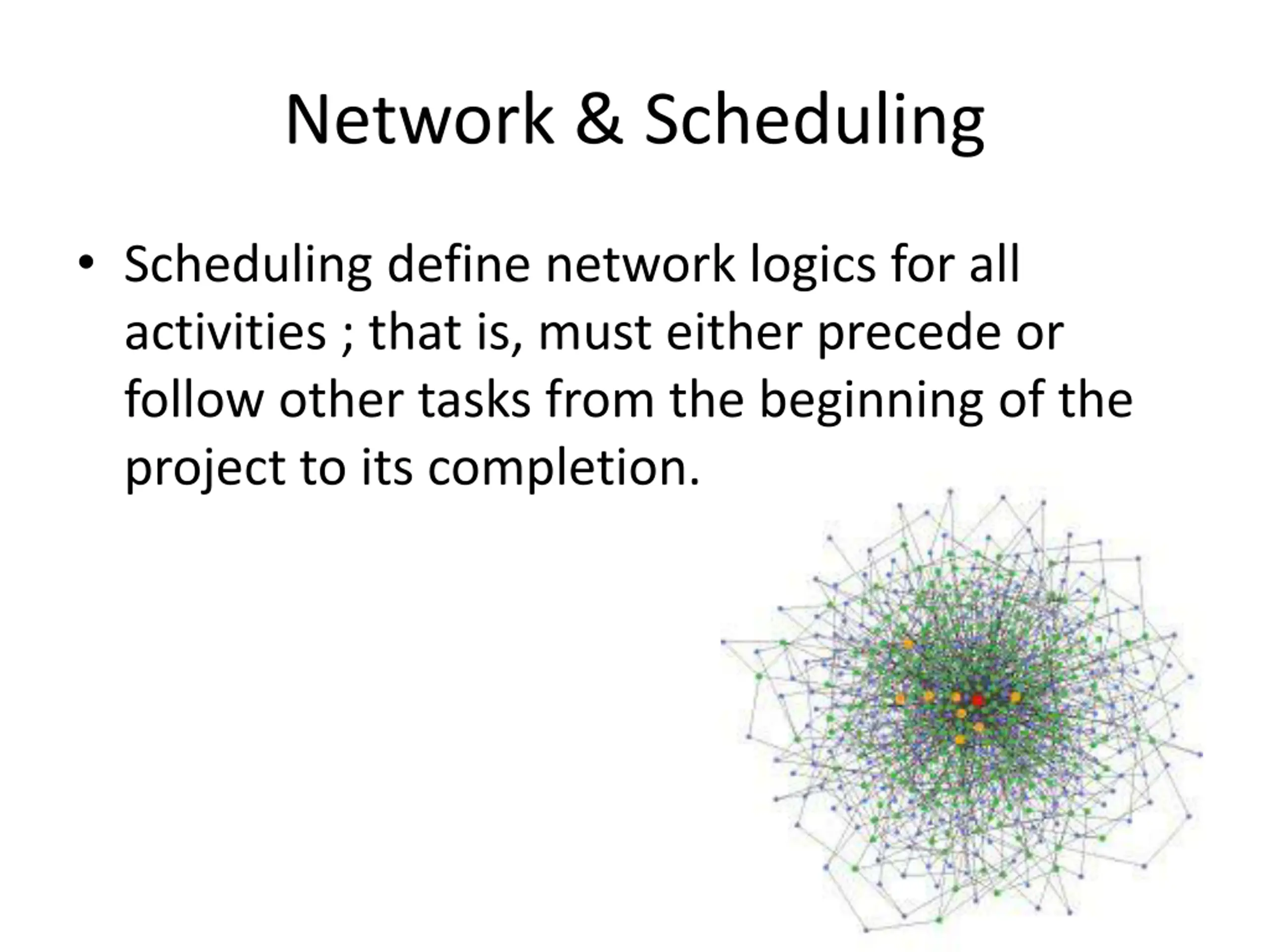 Network & Scheduling Scheduling define network logics for all activities ; that is, must either precede or follow other tasks from the beginning of the project to its completion.
