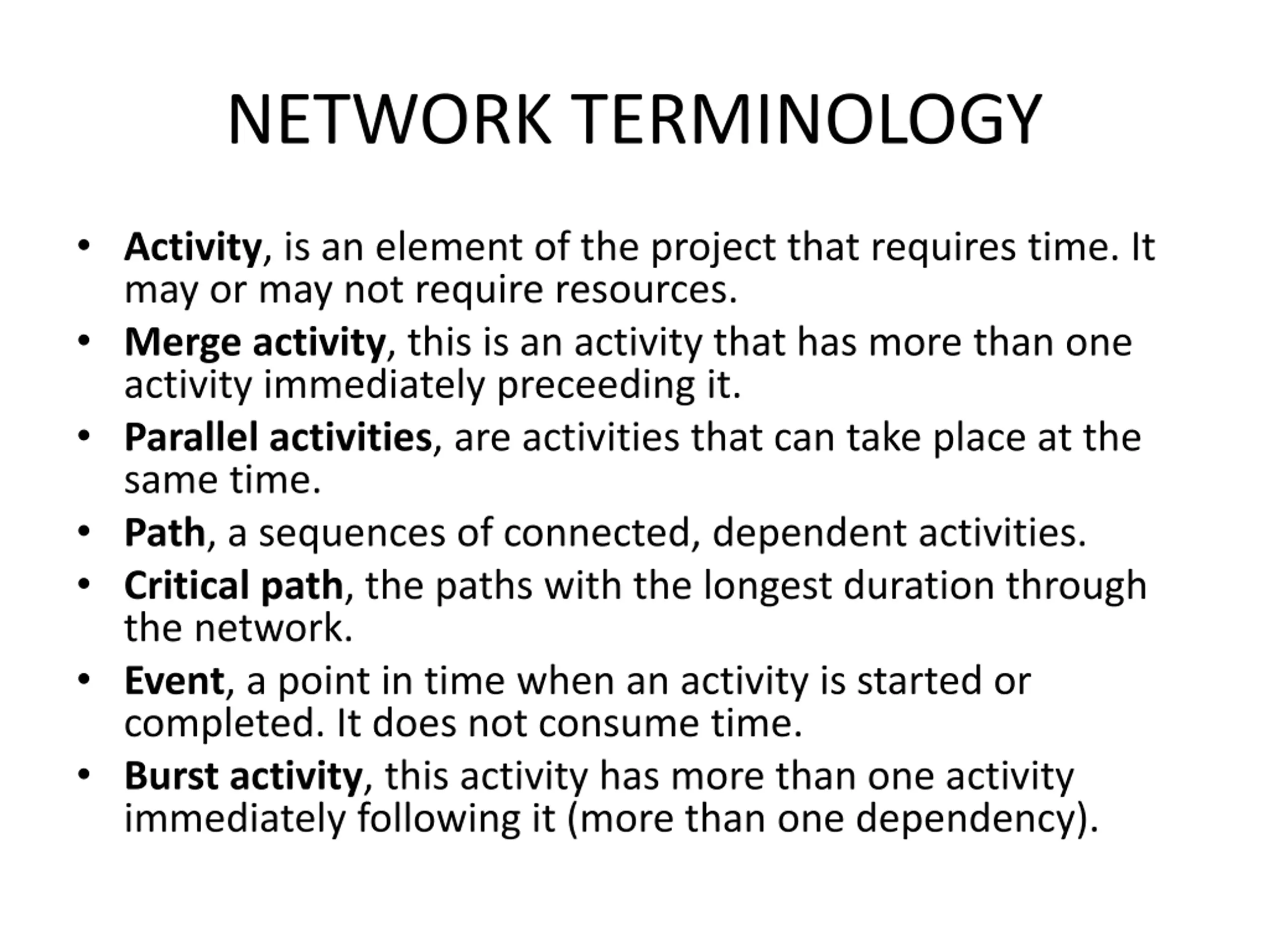 NETWORK TERMINOLOGY Activity, is an element of the project that requires time. It may or may not require resources. Merge activity, this is an activity that has more than one activity immediately preceeding it. Parallel activities, are activities that can take place at the same time. Path, a sequences of connected, dependent activities. Critical path, the paths with the longest duration through the network. Event, a point in time when an activity is started or completed. It does not consume time. Burst activity, this activity has more than one activity immediately following it (more than one dependency).