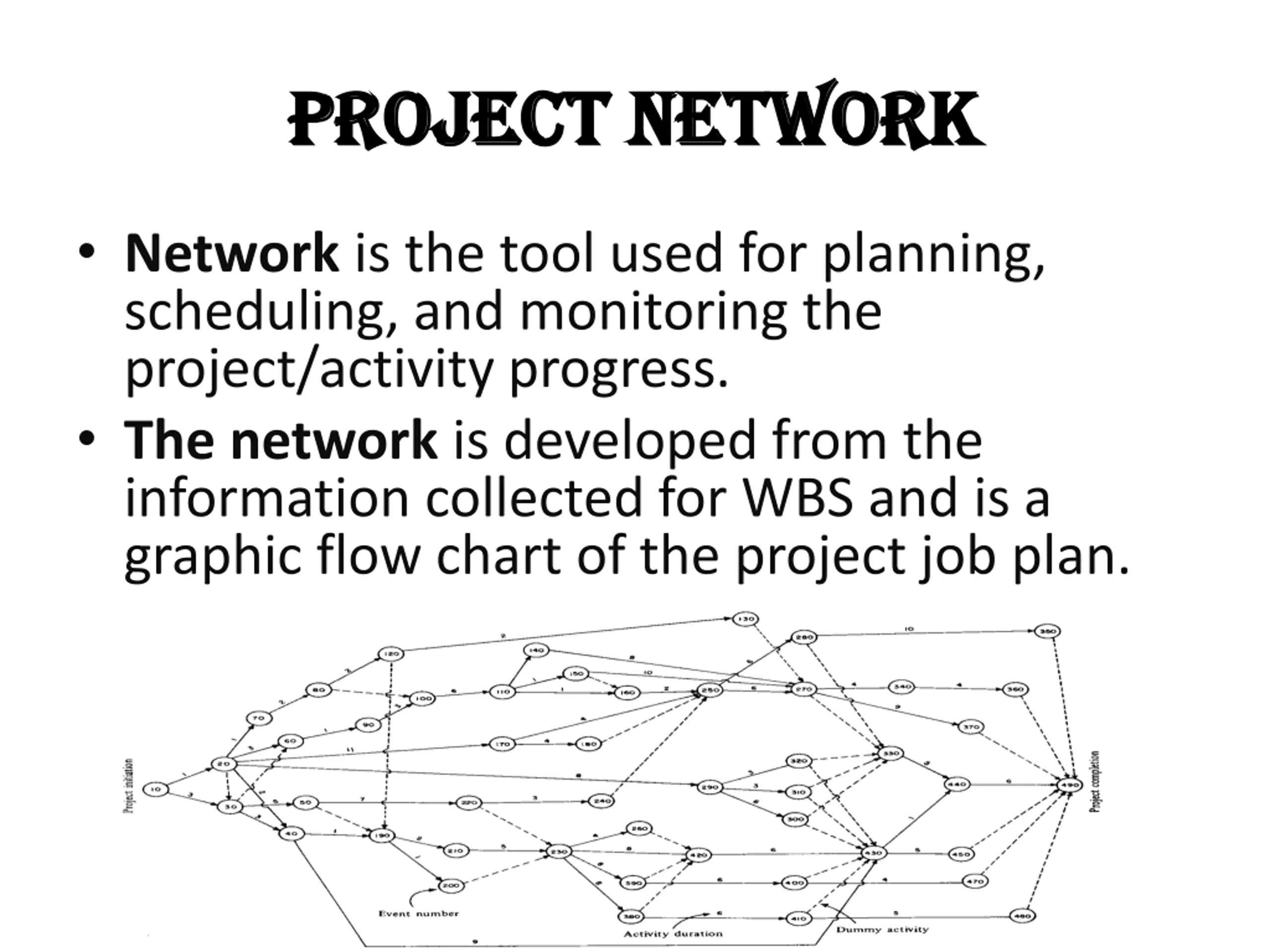 Project NETWORK Project NETWORK Network is the tool used for planning, scheduling, and monitoring the project/activity progress. The network is developed from the information collected for WBS and is a graphic flow chart of the project job plan.