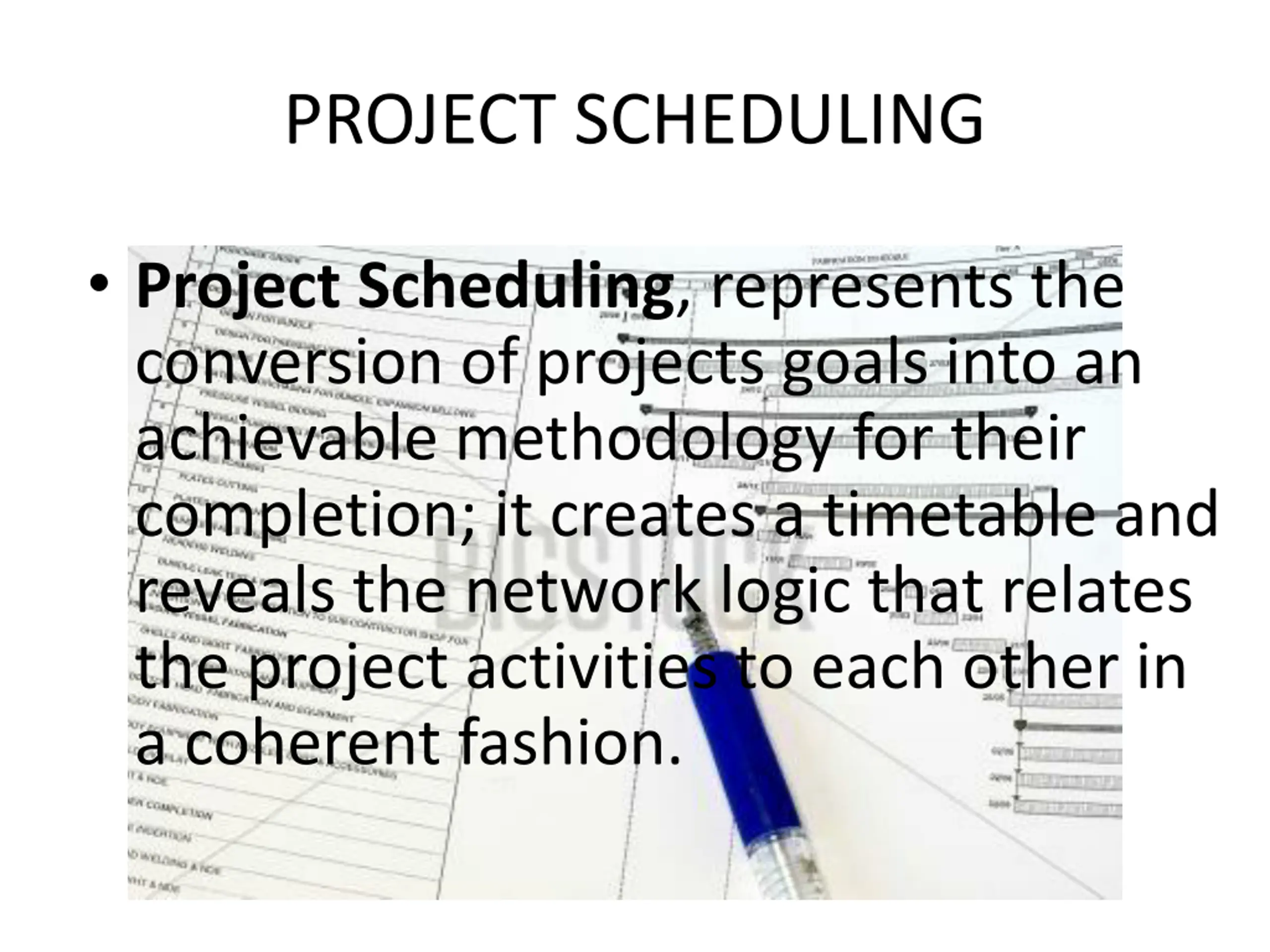 PROJECT SCHEDULING Project Scheduling, represents the conversion of projects goals into an achievable methodology for their completion; it creates a timetable and reveals the network logic that relates the project activities to each other in a coherent fashion.